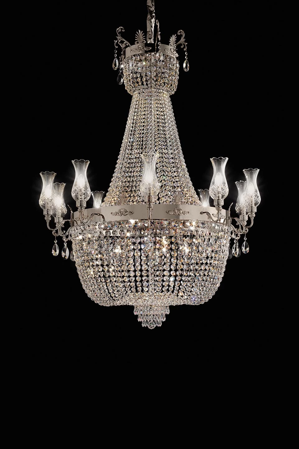 Superbe lustre montgolfière dans un style classique, avec son rideau de pampilles en cristal qui couvrent une structure métallique chromée. 10 ampoules sont logées dans une série de délicates tulipes de verre fixées sur de courts cols de cygne, et l’anneau de métal qui cintre le lustre est décoré de médaillons de moulures florales. 10 autres lumières garnissent le corps du lustre et mettent en valeur les pampilles de cristal taillé. Le tout est suspendu sur un cache-piton par une chaîne discrète et assortie. Lustre monumental, il nécessite une hauteur de plafond supérieure à 3.90m.