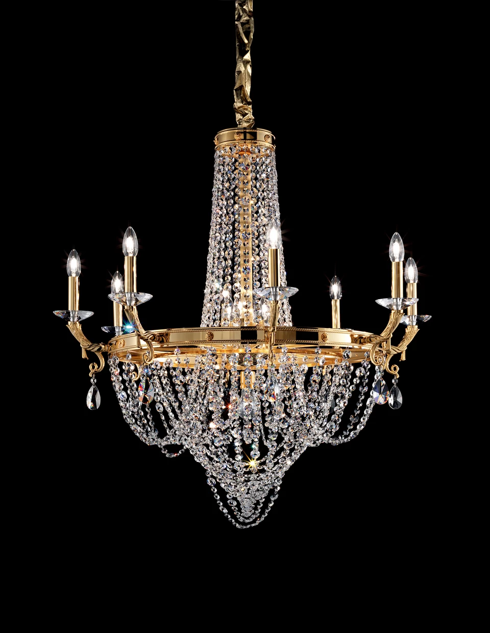 Ce lustre montgolfière porte 8 bras répartis sur un anneau finement décoré. Les bras courts portent bobèches en verre et fourreaux dorés. La forme est donnée par les colliers de perles en cristal taillé qui relient les différents éléments. En plus des 8 lumières portées sur les bras, 4 autres illuminent le cœur du lustre et une 5ème est orientée vers le bas. La maison Masiero, spécialisée dans la manufactures de lustres de style vénitien, allie matériaux d’excellence à un savoir faire technique d’exception depuis les années 1980. D’autres lustres montgolfières sont proposés sous les références 18110169 et 18110173.