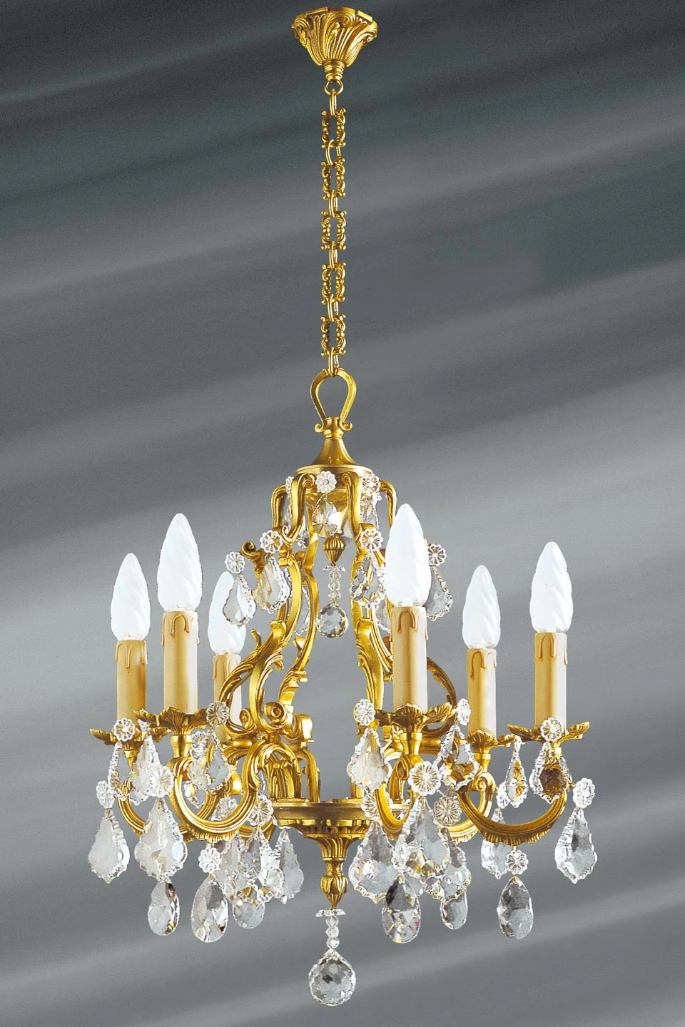 D’un parfait équilibre de formes, ce ravissant lustre Louis XV en cristal de bohème et bronze massif patiné vieil or est peut être facilement installé dans des espaces aux dimensions conventionnelles: avec une hauteur (hors chaîne) de 75cm, une hauteur sous plafond de 2m70 est suffisante. La chaîne livrée peut être raccourcie au moment de l’installation. Six bras en double volute, finement sculptés et décorés de motifs en feuille d’acanthe repliées, s’écartent d’une partie centrale inférieure (le culot) décorée d’un motif assorti. Ces branches, d’un parfait équilibre, soutiennent chacune à leur extrémité un bougeoir. Les bassins (coupelles situées à la base des bougeoirs) sont finement travaillés en feuille d’acanthe. Dans un mouvement particulièrement gracieux, chaque branche est reliée à un élément en double volute également sculpté et orné. Ces six éléments se rejoignent à la partie supérieure du lustre. De nombreuses pampilles en cristal de bohème décorent cet ensemble. Elles sont taillées en poire, rosaces et feuilles. La fabrication, impeccable, est réalisée de façon exclusivement traditionnelle dans les ateliers français de ce fabricant d’exception. Ce lustre existe également en version à cinq lumières, disponible parmi les options de commande ci-dessous.