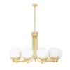 Superbe lustre Sputnik 12 lumières Ariana au style rétro années 60, avec sa structure dorée en étoile en laiton vieilli et ses boules de verre opale brillant qui forment une explosion de lumière. Le modèle est composé d’une sphère centrale dorée à partir de laquelle rayonnent 12 tiges de longueurs différentes dont les extrémités sont en trompette et accueillent chacune une boule en verre opale brillant. Ariana est suspendu au plafond par une courte chaine dorée et une tige à un support de plafond bombé.