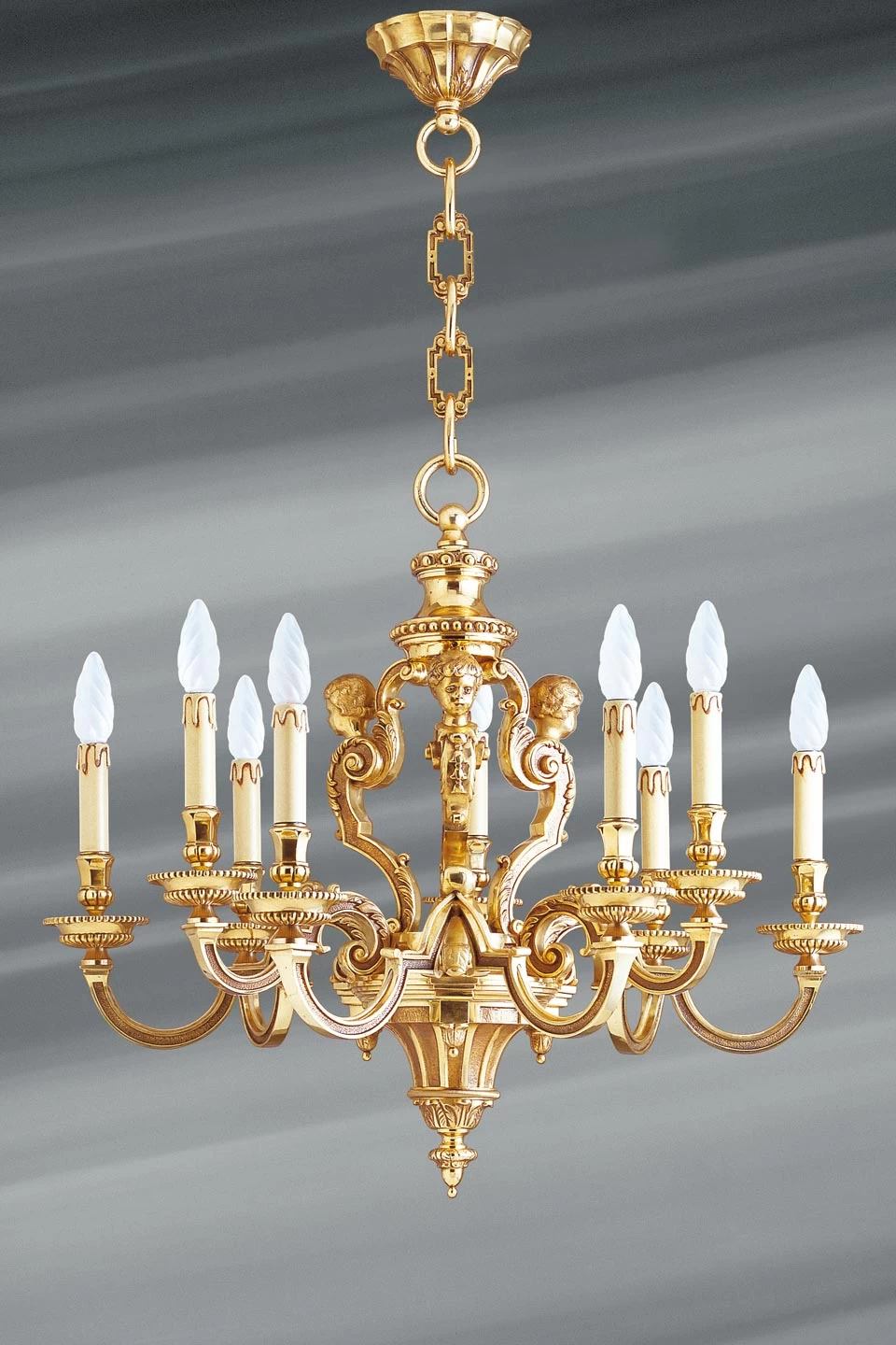Majestueux, ce lustre doré de style Louis XIV superbement travaillé est muni de neuf lumières. Son dessin est particulièrement harmonieux et équilibré. Il est réalisé en bronze massif, et a reçu une patine vieil or en parfaite adéquation stylistique. La partie centrale se scinde en trois bras en volute, montés sur clavette, chacun orné d’une figurine. La partie inférieure de ce lustre Louis XIV est tout aussi finement ouvragée et contribue aux proportions parfaites de ce luminaire. A la base des bougeoirs les bassins sont décorés de motifs en perle (ou plus précisément en godron). Ce lustre est suspendu à une chaîne coordonnée, dont la longueur est réglable. Avec une hauteur de 100cm hors chaîne, ce lustre est idéalement placé sous des plafonds d’une hauteur supérieure à 3m. Il existe une applique assortie, visible sous la référence 12020138.
