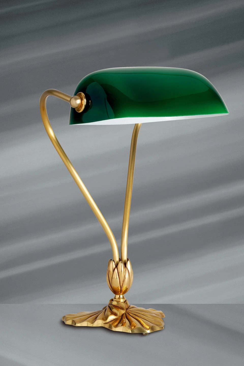 Retrouvez l’esthétique classique de la collection Nymphéa avec cette lampe de bureau au style de lampe de bibliothèque américaine, tout de laiton et de vert. La lampe est composée d’un pied en nénuphar doré de laiton, surmonté d’une jolie fleur de laquelle jaillie le pied qui se divise en deux bras afin de créer une pince qui tient l’abat-jour en demi-cylindre de verre vert à l’extérieur et blanc à l’intérieur, de manière à réfléchir la lumière.