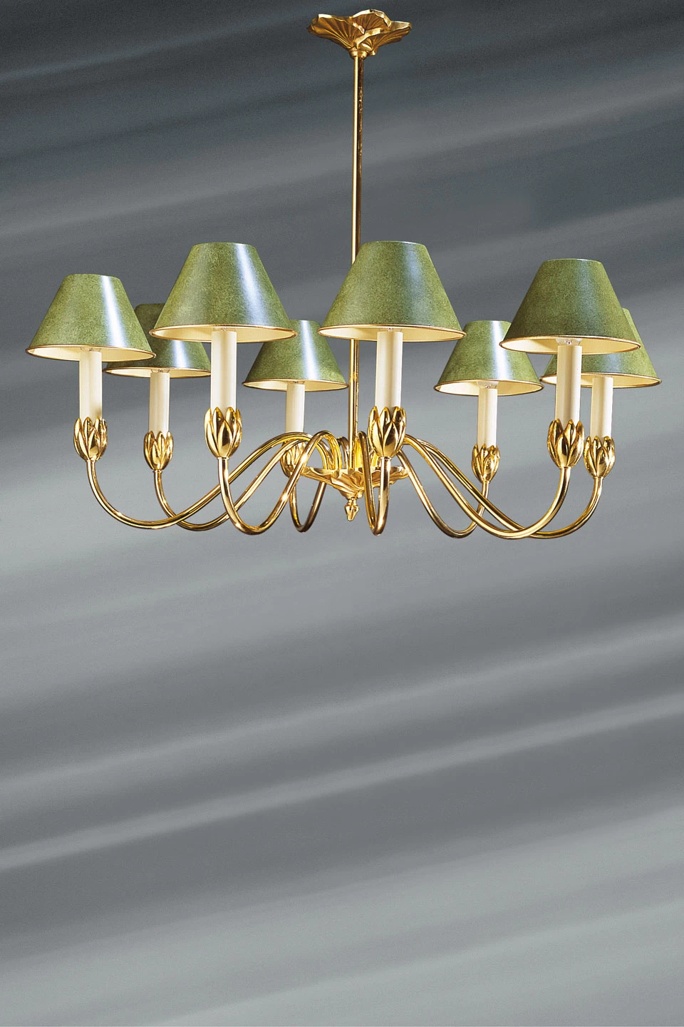 Pour les amateurs d’une certaine sobriété qui ne renonce pas à l’élégance, la collection Classique propose ce superbe lustre Nymphéa 8 lumières doré tout de laiton et d’abat-jour en métal peint en vert. Le modèle est doté de 8 bras en col de cygne jaillissant d’une petite soucoupe centrale moulée pour évoquer un nénuphar et décorée d’une petite graine discrète. Les bras sont prolongés d’une bobèche qui représente une fleur en train de s’ouvrir, permettant de fixer les fourreaux de lampe qui se déguisent en bougie, donnant ainsi un air authentique au modèle. Les fourreaux sont surmontés d’un abat-jour conique en métal laqué patiné peint en vert, dont les bordures dorées sont retroussées, et l’intérieur blanc de manière à refléter efficacement la lumière. Le lustre est fixé sur une tige de laiton et relié à un cône de plafond stylisée à l’image de la soucoupe centrale du lustre.