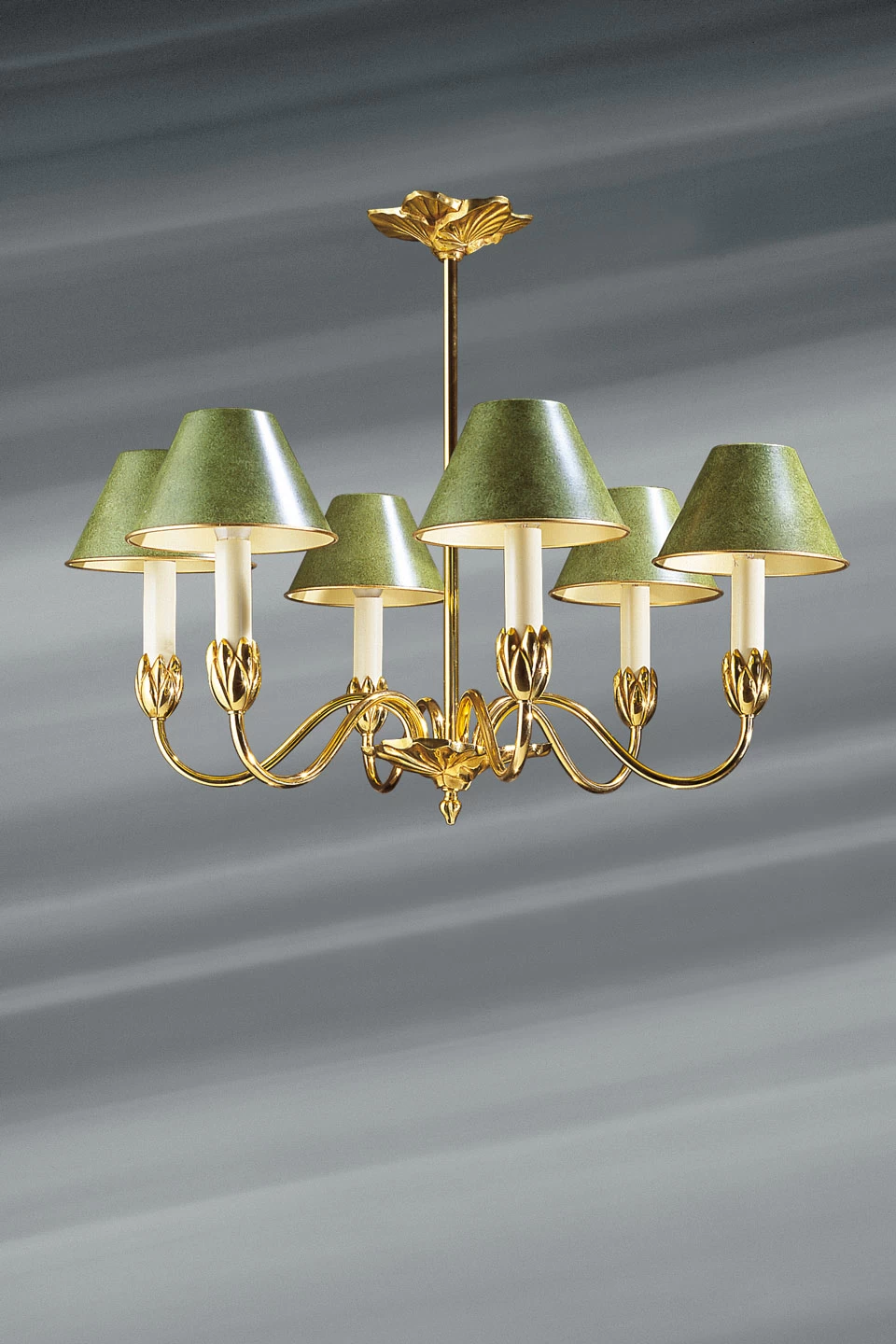 Pour les amateurs d’une certaine sobriété qui ne renonce pas à l’élégance, la collection Classique propose ce superbe lustre Nymphéa 6 lumières doré tout de laiton et d’abat-jour en métal peint en vert. Le modèle est doté de 6 bras en col de cygne jaillissant d’une petite soucoupe centrale moulée pour évoquer un nénuphar et décorée d’une petite graine discrète. Les bras sont prolongés d’une bobèche qui représente une fleur en train de s’ouvrir, permettant de fixer les fourreaux qui se déguisent en bougie, donnant ainsi un air authentique au modèle. Les pieds sont surmontés d’un abat-jour conique en métal laqué patiné peint vert, dont les bordures dorées sont retroussées, et l’intérieur blanc de manière à refléter efficacement la lumière. Le lustre est fixé sur une tige de laiton et relié à un cône de plafond stylisée à l’image de la soucoupe centrale du lustre.