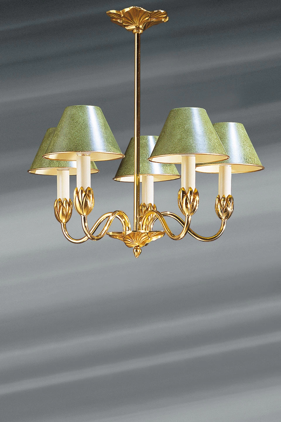Pour les amateurs d’une certaine sobriété qui ne renonce pas à l’élégance, la collection Classique propose ce superbe lustre Nymphéa 5 lumières doré tout de laiton et d’abat-jour en métal peint vert. Le modèle est doté de 5 bras en col de cygne jaillissant d’une petite soucoupe centrale moulée pour évoquer un nénuphar et décorée d’une petite graine discrète. Les bras sont prolongés d’une bobèche qui représente une fleur en train de s’ouvrir, permettant de fixer les fourreaux qui se déguisent en bougie, donnant ainsi un air authentique au modèle. Les pieds sont surmontés d’un abat-jour conique en métal laqué patiné peint vert, dont les bordures dorées sont retroussées, et l’intérieur blanc de manière à refléter efficacement la lumière. Le lustre est fixé sur une tige verticale de laiton et relié à un cône de plafond stylisée à l’image de la soucoupe centrale du lustre.