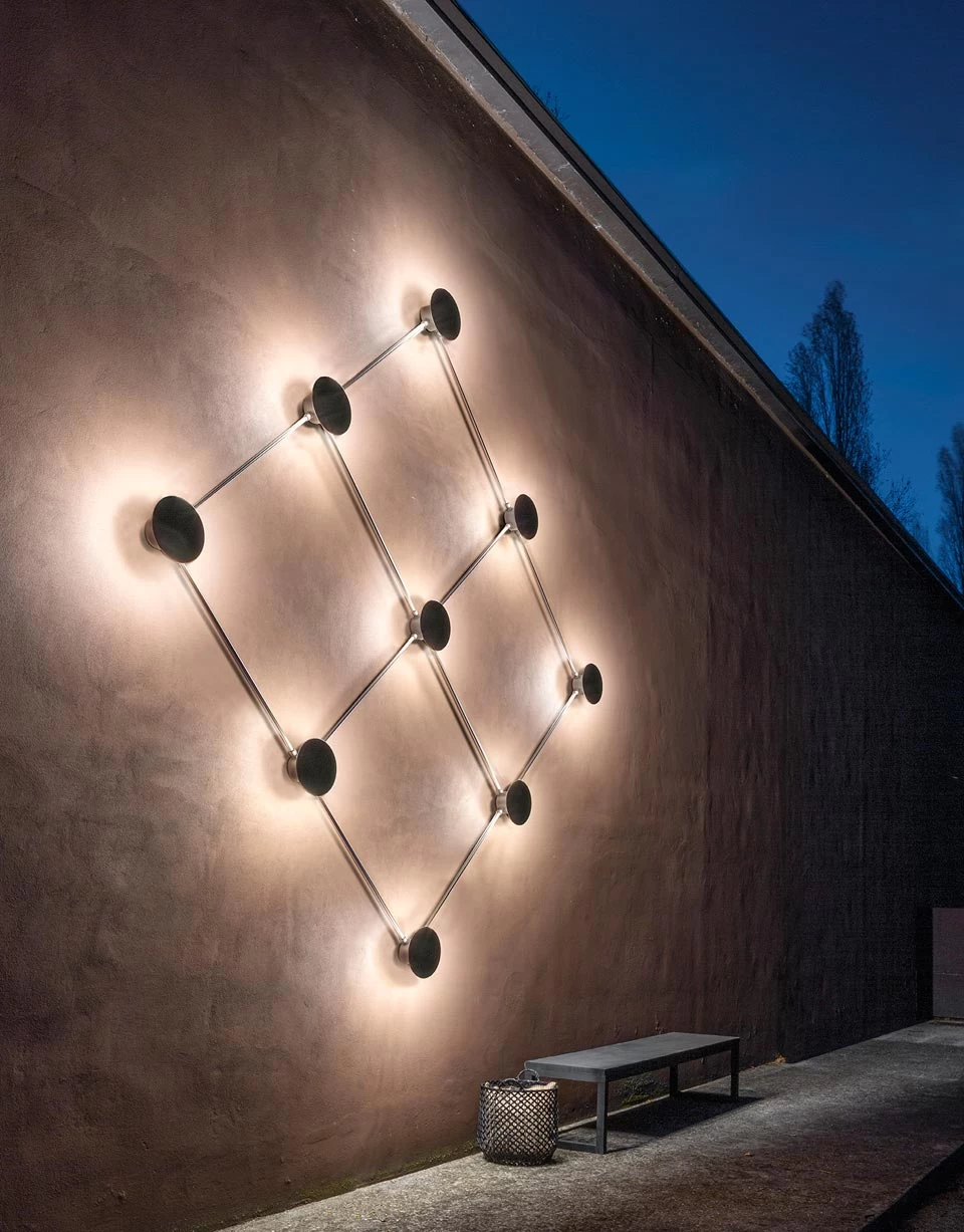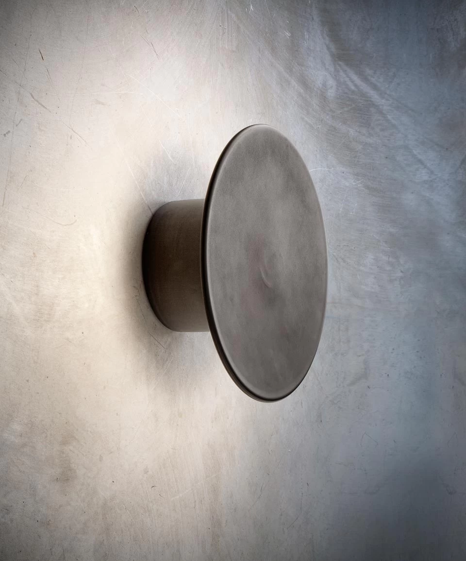 Ce modèle de la collection Pasdedeux est une applique d’extérieur au design contemporain et minimaliste, avec son support mural cylindrique coiffé d’un diffuseur rond et plat, qui projette la lumière sur le mur. Entièrement réalisée en cuivre avec une très belle finition bronze patiné, elle se fond dans votre jardin ou sur votre façade et la protection IP65 dont l’applique est munie garantie une excellente résistance à l’humidité et aux intempéries. La maison italienne Aldo Bernardi s’inspire de techniques artisanales de la région d’Aloso pour concevoir une gamme de luminaires contemporains d’excellente qualité. Le modèle est particulièrement adapté à une pose en série à partir d’une seule alimentation, tel que sur la photo secondaire, nous consulter pour plus d’information.