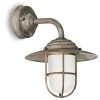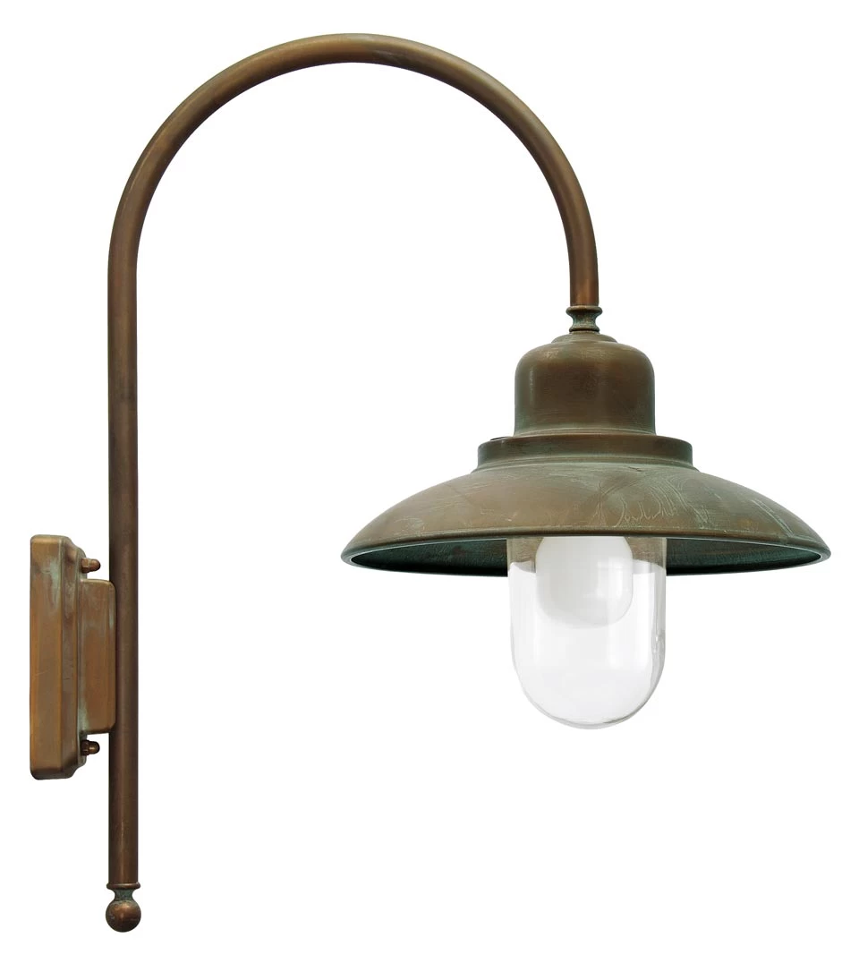 Une belle applique d’extérieur de la gamme campagne, issue de la série Patio, constituée d’un abat-jour en forme de cloche évasée et d’un verre de protection, fixés au bout d’un bras en U et un support mural rectangulaire. L’ensemble est en laiton avec une finition vieillie du plus bel effet, avec ses touches de vert-de-gris qui donne une patine authentique au modèle. L’applique est équipée d’une protection IP44, et la maison italienne Moretti développe une collection en laiton massif d’excellente qualité dont les modèles d’extérieur sont extrêmement résistants aux effets corrosifs du sel en bord de mer par exemple, ou du froid en montagne.