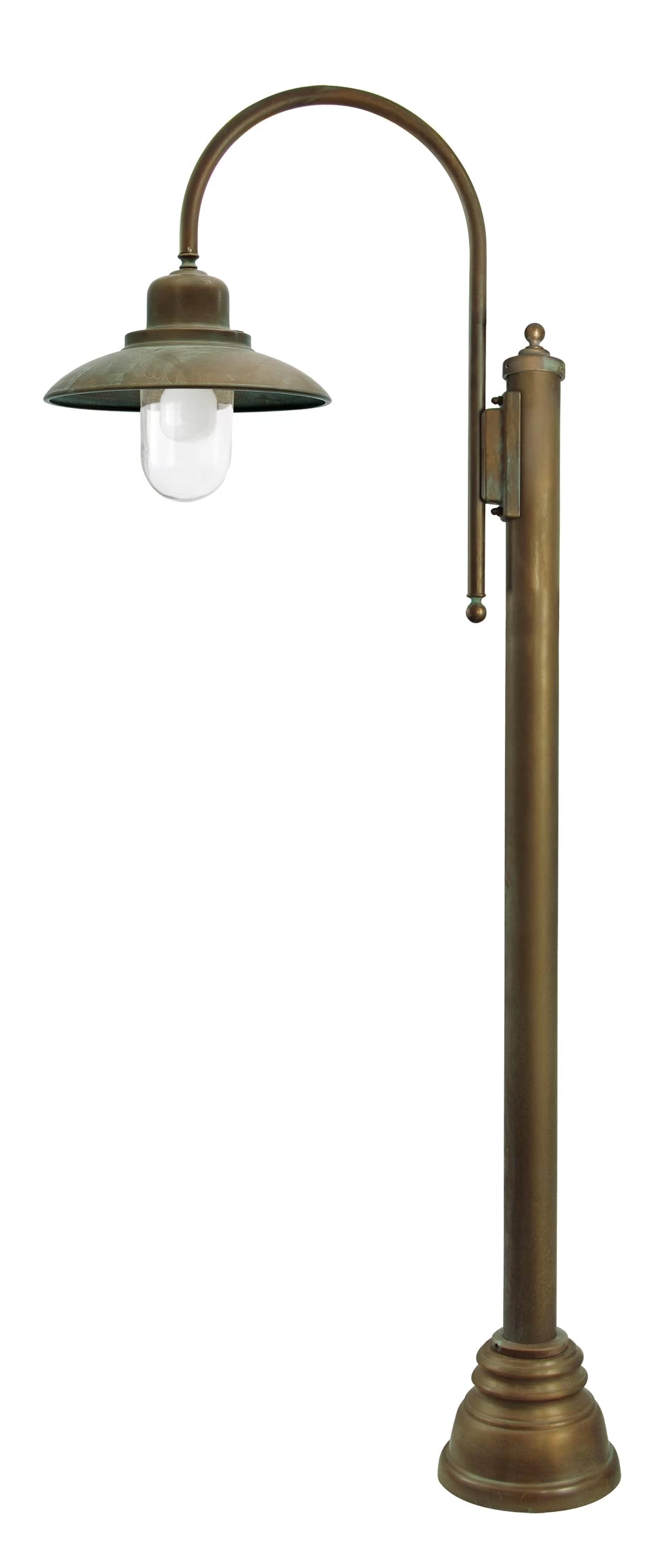 Beau lampadaire d’extĂ©rieur de la gamme Campagne, issu de la sĂ©rie Patio. Entièrement rĂ©alisĂ© en laiton finition vieillie, parcouru de touches de vert-de-gris qui donne une patine authentique au modèle, il est constituĂ© d’un socle circulaire, d’une pied droit prolongĂ© d’un bras en U au bout duquel est fixĂ© un abat-jour en cloche Ă©vasĂ©e, qui accueille une protection en verre transparent pour protĂ©ger l’ampoule. C’est un modèle pourvu de la protection IP44, et l’usage du laiton massif par la maison italienne Moretti en fait un modèle extrĂŞmement rĂ©sistant aux conditions d’extĂ©rieur.
