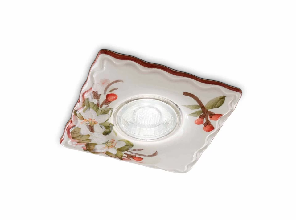 Très joli petit plafonnier carré de la collection Pescara, une ligne de style campagne de projecteurs encastrés en céramique de différentes formes. Le modèle est doté d’une plaque de céramique carrée équipée d’un spot encastré en son centre. Le plafonnier est décoré d’un liseré rose sur sa tranche et d’un motif de fleurs blanches sur son parterre de feuilles vertes peint à la main. La maison italienne Ferroluce, en activité depuis 1982, fabrique ses luminaires exclusivement en Italie, aux mains des meilleurs artisans céramistes.