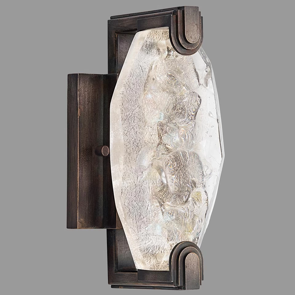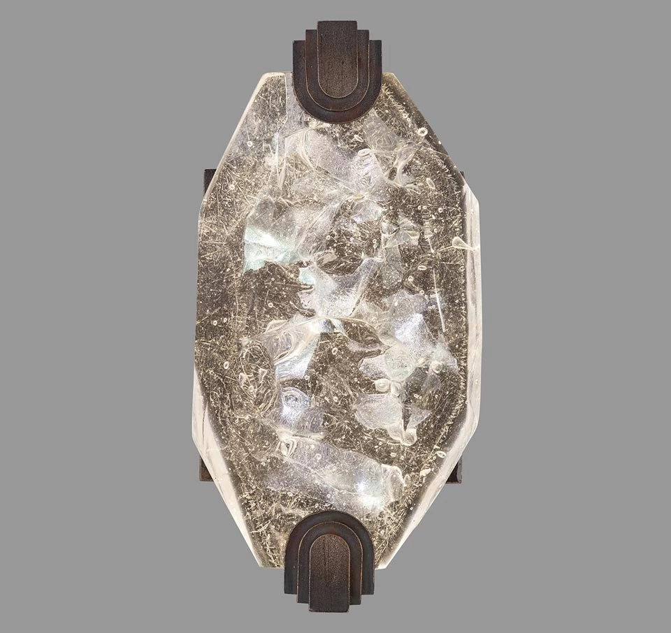 Courte et équilibrée, constituée d’un base murale discrète en finition bronze patiné, qui tient un cristal translucide taillé en hexagone entre deux petites pinces, cette petite applique élégante est issue de la collection Allison Paladino. La lumière de l’applique est produite par des LEDs, directement intégrées au cristal. Une collection toute de cristal, étincelante d’une lumière crépusculaire, pâle comme l’Arctique, qui ondule comme une aurore boréale, livrée la marque Fine Art Lamps en collaboration étroite avec le sculpteur de verre Frank Eglesby. La ligne allie finitions impeccables d’or, d’argent ou de bronze avec des cristaux hexagonaux qui s’intègrent chacun de manière unique aux luminaires car taillés individuellement grâce à un processus complexe, développé à l’origine pour des matériaux destinés à un usage dans l’espace. La marque frappe une nouvelle fois par sa capacité à transformer la lumière en véritable œuvre d’art. La ligne comprend onze suspensions (16090028, 16090029, 16090030, 16090037, 16090038, 16090039, 16090040, 16090041, 16090042, 16090049, 16090050, 16090051) et cinq autres appliques (16090031, 16090032, 16090033, 16090035, 16090036).