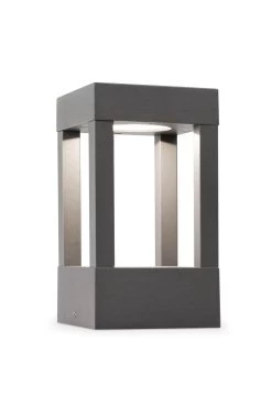 Agra est une petite balise d’extérieur design en forme de lanterne moderne et géométrique, pour éclairer un coin de votre terrasse. Le modèle est en aluminium, avec finition gris sombre, constitué de deux carré de part et d’autres de 4 piliers qui forment une structure architecturale. Dans la partie supérieur intérieure est encastré le module LED derrière un diffuseur en verre transparent. La lanterne résistera aux éléments grâce à sa protection IP54.