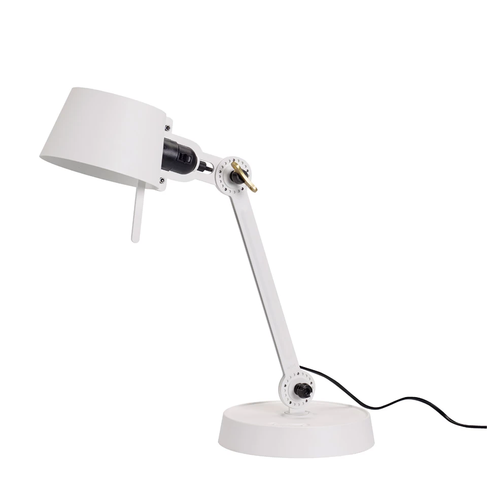 Le petit modèle de la lampe de bureau Bolt Desk en métal blanc pur garde l’esprit atelier de la gamme, avec un bras et deux rotules crantées. Un très bel outil en forme de papillon est fourni pour serrer les rotules. La finition du métal est mate et légèrement grainée pour accentuer l’aspect massif et industriel de la lampe. Elle est composée d’un seul bras plus court que celui de ses consoeurs. Il est relié au réflecteur et au socle par des rotules, qui permettent un réglage précis et d’un réflecteur orientable à l’aide d’une poignée sur le côté. Le socle circulaire en acier massif est très stable. La lampe est livrée avec un très bel outil papillon siglé avec la marque TONONE et chaque lampe est numérotée. Bolt est une collection complète de 22 lampes dessinées par le designer néerlandais Anton de Groof. Les lampes TONONE se distinguent par leur design soigné, la densité de leurs éléments en acier et en aluminium et leurs très belles finitions. Elles sont entièrement fabriquées à la main au Pays Bas par des artisans hautement qualifiés. La petite lampe Bolt Desk se décline en 7 couleurs mates, par exemple en bleu orage visible sous la référence 17090124, en orange sous la référence 17090125, en khaki sous la référence 17090126, en gris clair sous la référence 17090129 et en blanc écru sous la référence 17090127. Le même modèle existe également dans les 7 couleurs, avec un grand bras (voir le modèle 17090113, en noir). D’autres modèles proposent différentes combinaisons de bras, de modes de fixation et de tailles. L’outil papillon est doré par défaut, mais disponible également à la demande en noir, cuivre, et acier.