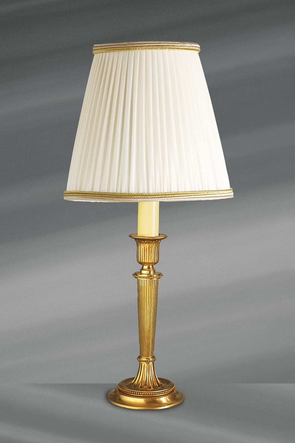 Cette très délicate lampe de style Louis XVI, en bronze massif et à abat-jour blanc plissé, se caractérise par les cannelures de son corps et de ses différents éléments, bobèche et pied. La finition vieil or de son bronze donne à son décor, relief et profondeur. Des colliers de fines perles dorées viennent souligner la base de son pied et la fin de son corps d’où part la bobèche. Son unique bougie se situe dans le prolongement du corps de la lampe et est protégé par l’abat-jour plissé qui diffuse avec douceur son éclairage. La qualité du bronze de cette lampe et celle de son travail sont exceptionnels. Fruit des meilleurs et du travail sans pareil des artisans d’art de la Maison Lucien Gau, Cette lampe a été dessinée et assemblée de façon entièrement manuelle après avoir été moulée au sable ce qui garantit la perfection de son décors.