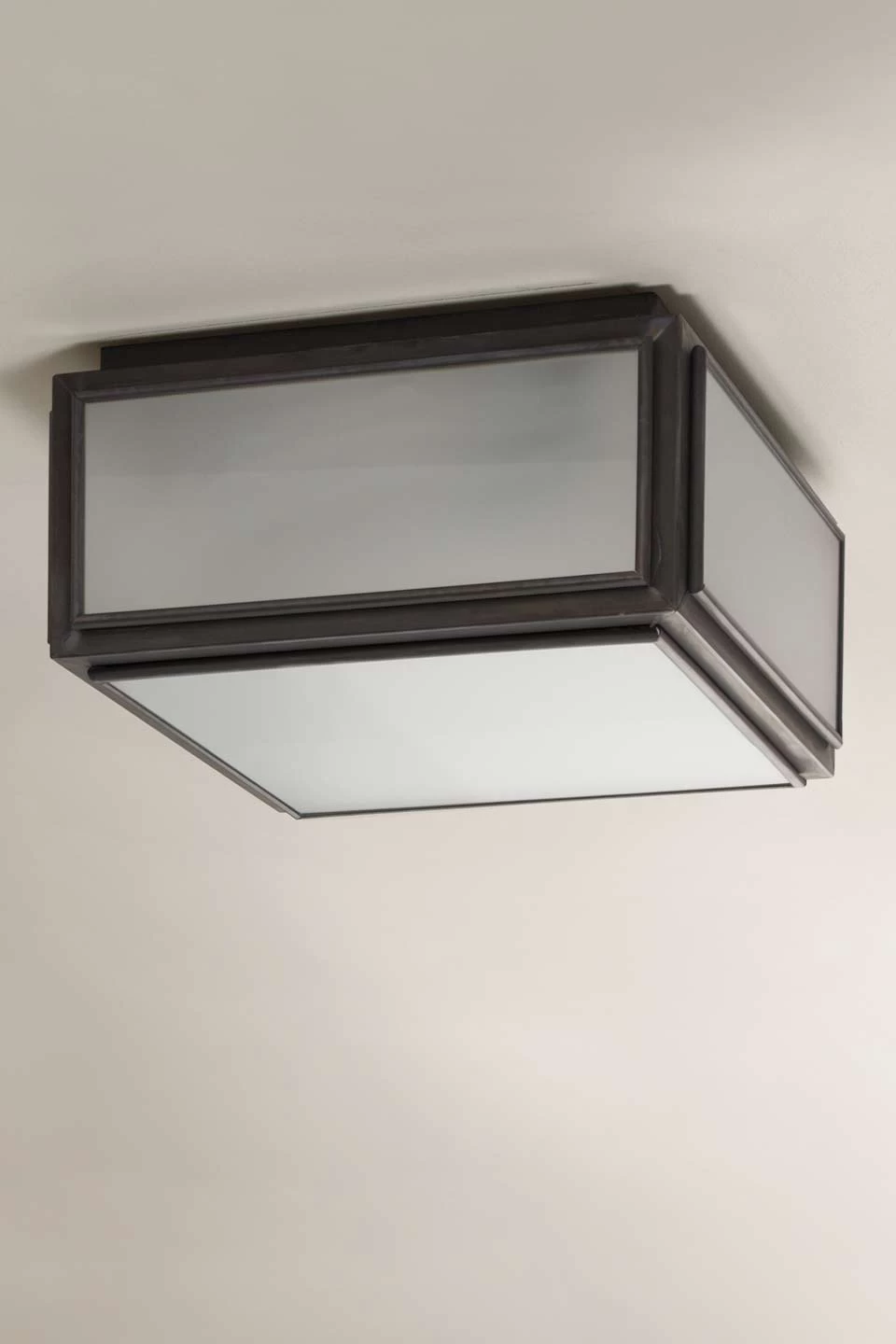 Ce petit plafonnier est réalisé en bronze découpé et assemblé à la main. Carré, il est muni sur cinq de ses faces d’une verrerie dépolie, pour une lumière douce et homogène. Ce plafonnier est parfait pour éclairer un couloir ou une entrée, son style traditionnel et très pur assure une intégration parfaite à une environnement classique ou rustique. Il est équipé d’une ampoule halogène de 40W, fournissant un éclairage identique à celui d’une ampoule traditionnelle de 60W. Eteint, il reste d’une grande élégance et pureté de formes. Sur la partie supérieure, une mince semelle en bronze crée un décroché particulièrement raffiné. Ce plafonnier est équipé d’une fermeture à ressort. Avec une hauteur de 12.5cm seulement, il peut être installé sous des plafonds bas.