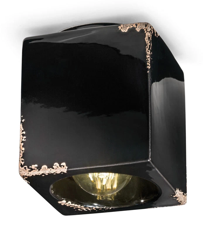 Elégant et résolument vintage, ce plafonnier minimaliste se présente sous la forme d’un cube en céramique noire émaillée, écaillée pour lui donner cet air patiné selon un procédé artisanal. Le luminaire accueille l’ampoule à l’intérieur, et produit un éclairage dirigé vers le bas. Il peut également être posé en applique pour un résultat très original. Ferroluce est une maison italienne qui travaille la céramique depuis 50 ans, et qui réussit le pari de marier céramique traditionnelle à des formes de luminaires contemporaines et chics. Ce plafonnier peut être commandé dans les 7 coloris visibles sur le nuancier dans la seconde image sur cette page. Par défaut, le produit est en noir, autres couleurs à préciser dans les instructions spéciales du bordereau de commande. Ce plafonnier est également proposé en céramique blanche sous la référence 18070224 et en finition béton sous la référence 18070225.