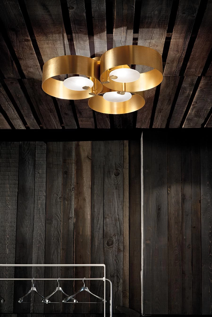 Sound est une collection complète de luminaires contemporains chics composés de un ou plusieurs anneaux en laiton satiné agrémenté de deux diffuseurs en verre blanc plus petit que l’anneau qui évoque la présence d’une perle. Le verre est décoré d’une sérigraphie blanche qui accentue cet effet. Ici, le plafonnier 3 lumières.