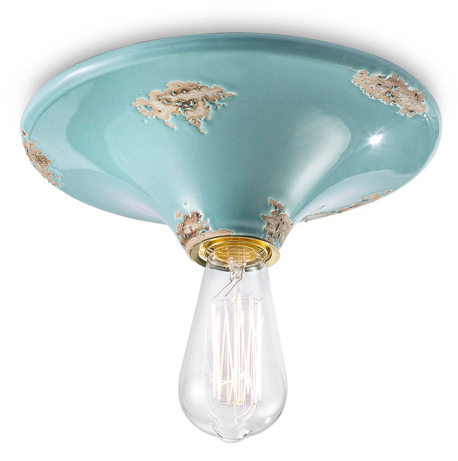 Ce plafonnier minimaliste au large socle rond en céramique turquoise est le complément idéal d’une déco au style industriel. La céramique est écaillée par endroit pour un aspect vieilli. Cette technique est parfaitement maitrisée par les céramistes de Ferroluce, maison italienne qui œuvre depuis 1982. Il est équipé une ampoule LED décorative imitant le filament des anciennes ampoules à incandescence. Ce plafonnier existe aussi en blanc sous la référence 18020002, en rose sous la référence 18020003, en orange sous la référence 18020006, en jaune sous la référence 18020004, en noir sous la référence 18020005, en framboise sous la référence 18020007 et en aqua sous la référence 18020008.
