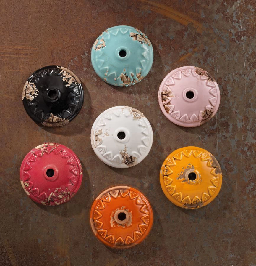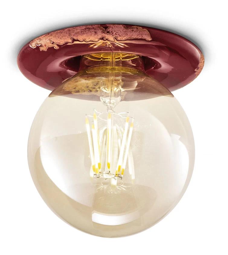 Incontournable de la collection Vintage, à disposer seul ou à plusieurs, ce plafonnier minimaliste en forme d’anneau aplati est en céramique rouge framboise écaillée selon un procédé artisanal, qui rend la pièce unique, et lui donne un style vintage. Il est livré avec une grosse ampoule ronde à éclairage LED imitant les anciennes ampoules à incandescence pour un style délicieusement rétro. Cette collection de la maison Ferroluce est le fruit du mariage d’une céramique de grande qualité, travaillée dans un style vintage, avec une esthétique et des formes industrielles et contemporaines. Ce plafonnier peut être commandé dans les 7 coloris visibles sur le nuancier dans la seconde image sur cette page. Par défaut, le produit est en rouge framboise, autres couleurs à préciser dans les instructions spéciales du bordereau de commande.