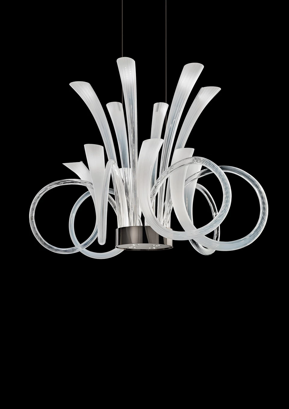 Pulse est un lustre contemporain en verre soufflé en dégradé de verre satiné blanc et transparent. Les éléments en verre, de la forme de cornes d’abondance, sont en verre sculpté et sont retenus par un anneau de métal couleur canon de fusil. Le puissant éclairage LED éclaire à la fois vers le haut en éclairage indirect et vers le bas en éclairage direct. Ce lustre est idéal en éclairage principal au milieu d’une grande pièce. Ce luminaire est entièrement réalisé à la main par des maîtres verriers en Italie et il est également proposé en taupe sous la référence 18050058.