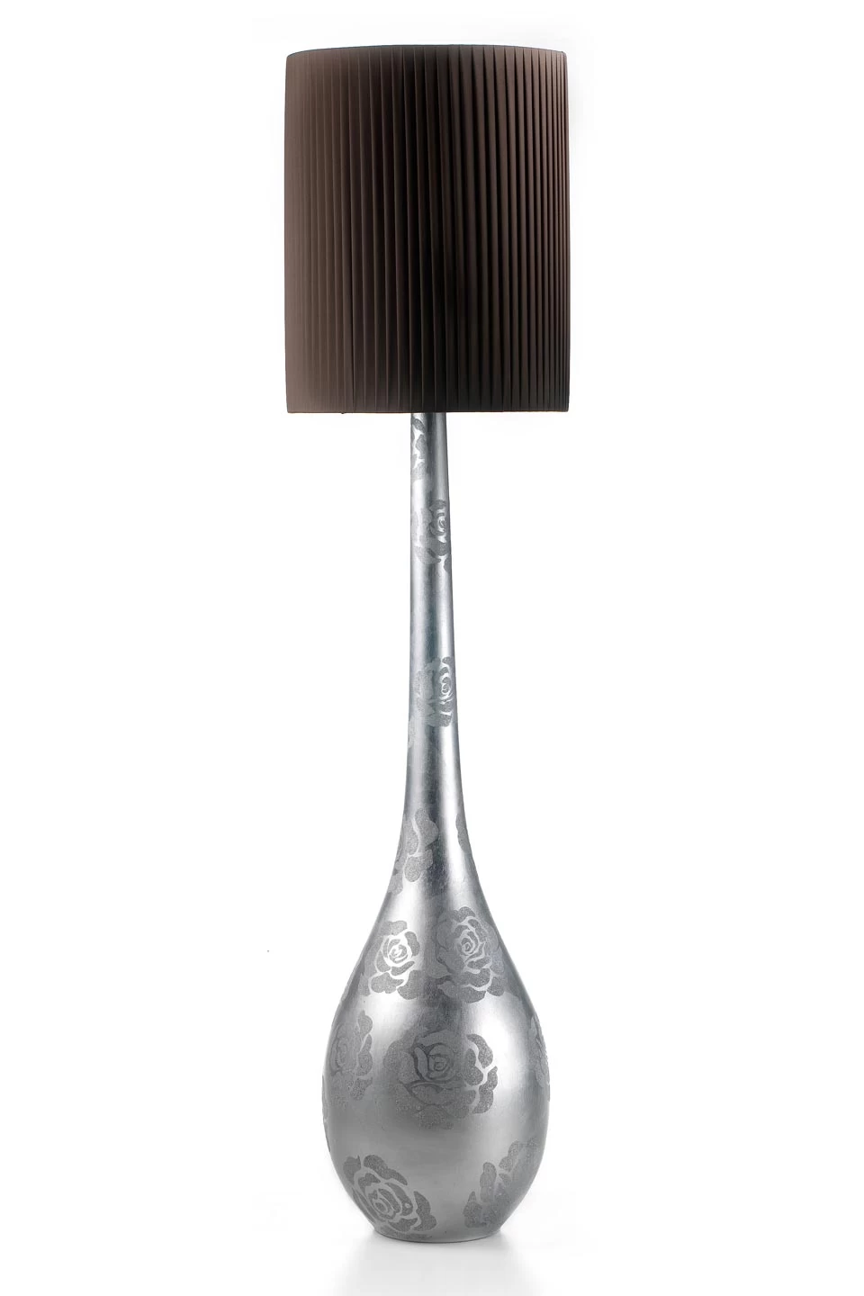 Raindrop est un très fin lampadaire en boule allongée, décoré à la feuille d’argent. Il est muni d’un abat-jour de soie plissée de couleur chocolat. Mesurant 173cm de hauteur, ce lampadaire est apte à rejoindre les environnements décoratifs les plus prestigieux. Ce lampadaire en boule est réalisé dans les ateliers de Stylnove Ceramiche, à Vicence en Italie. Du point de vue technique, il s’équipe de toute ampoule standard 230V E27, conventionnelle ou à économie d’énergie.