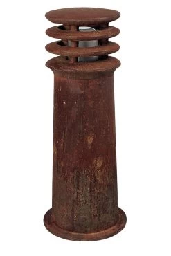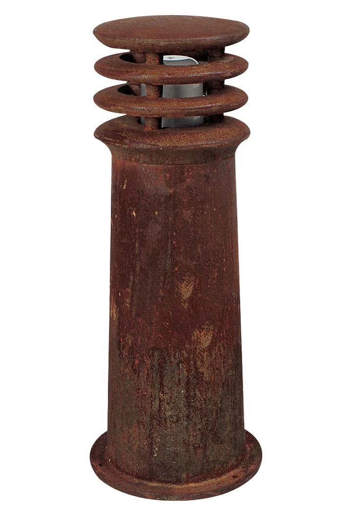 En forme de phare ou de bite d’amarrage, cette très belle balise de jardin Rusty de section ronde en fonte d’acier Ă l’aspect rouillĂ© est constituĂ©e d’un solide corps de section ronde, surmontĂ© par un diffuseur constituĂ© de 3 Ă©paisses lames de la mĂŞme matière, lĂ©gèrement incurvĂ©es. Cette balise de jardin existe en deux hauteurs, 40cm et 70cm. Elle se raccorde directement au secteur 230V, sa double isolation et son excellente Ă©tanchĂ©itĂ© IP55 lui assurent un fonctionnement durable et sans souci. L’ampoule Ă base consommation est logĂ©e dans une capsule Ă©tanche protĂ©gĂ©e par le diffuseur. Elle produit la lumière d’une ampoule Ă incandescence de 80W, tout en ne consommant que 11W de puissance Ă©lectrique. La fonte d’acier dont est constituĂ©e cette balise prend une patine d’oxydation couleur rouille, assurant une intĂ©gration esthĂ©tique et discrète aux plus beaux jardins, parcs et terrasses. Il existe un très Ă©lĂ©gant modèle assorti de section ronde, visible sous la rĂ©fĂ©rence 12050328, Ă©galement disponible en deux tailles.
