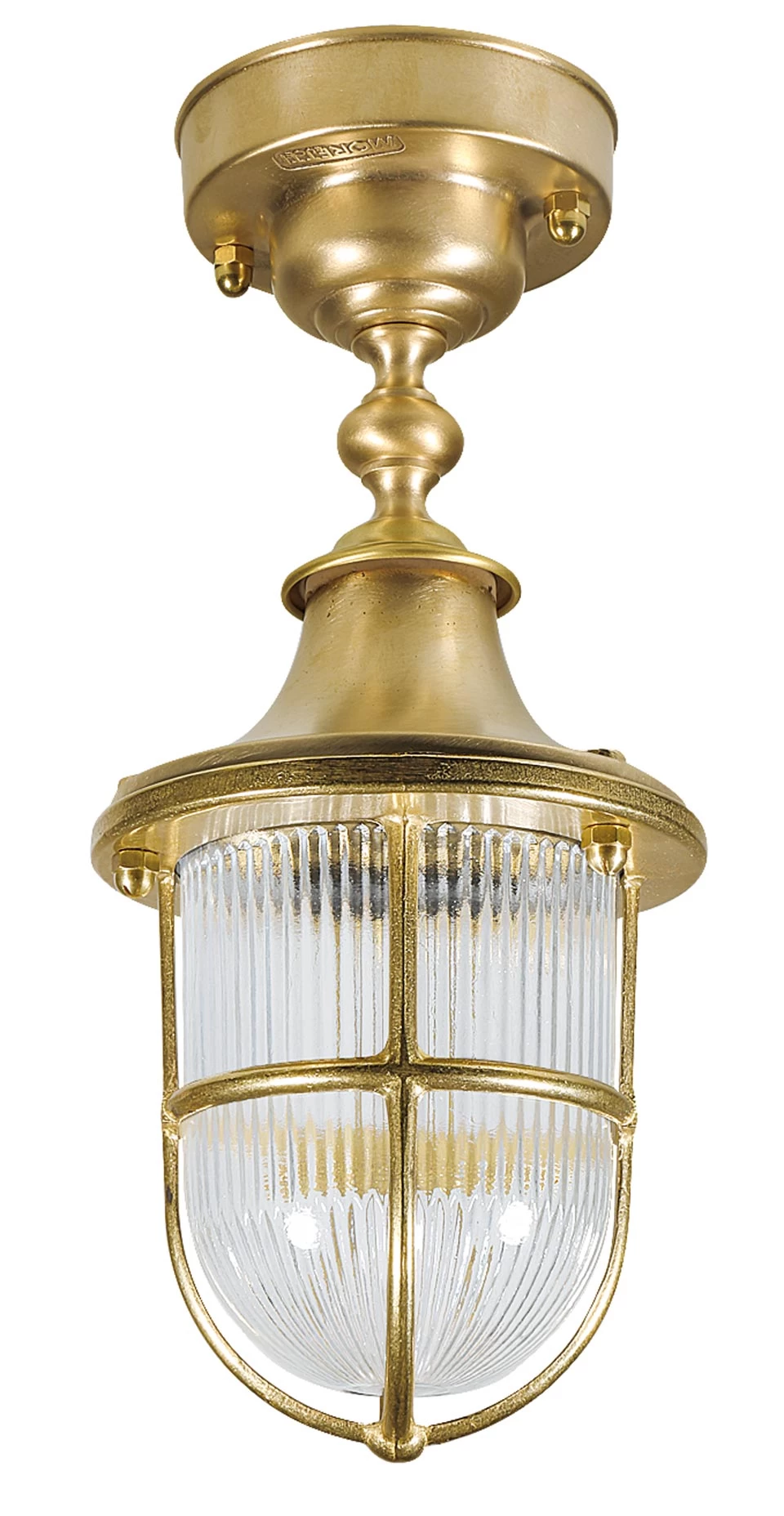 Beau plafonnier d’extérieur Santorini, de la gamme Marine. Inspiré des lampes de navires de croisière, elle est composée d’une cloche de verre transparent enchâssée dans une grille qui la protège et un socle de laiton en forme de cloche moulée, fixé à un support de plafond cylindrique. Le laiton est laissé au naturel, ce qui lui donne cette couleur dorée élégante et qui se patine avec le temps. La maison italienne Moretti utilise un laiton massif d’excellente qualité, et combiné à un protection IP44, livre des modèles d’extérieurs résistants aux intempéries, tant en bord de mer qu’en montagne.