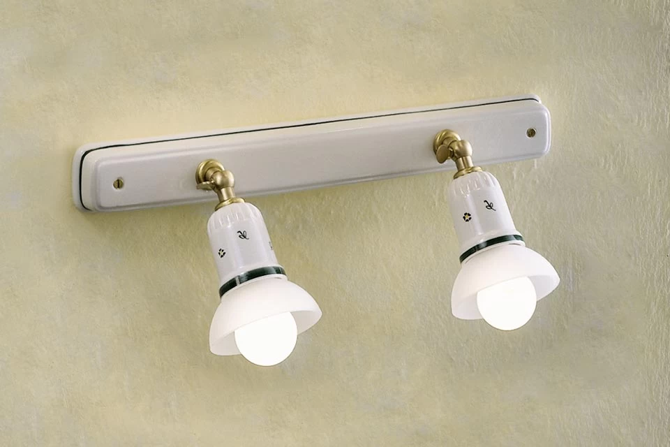 Charmante applique 2 spots articulés en céramique de la collection Savona, au style classique élégant et chaleureux avec son support mural linéaire et le corps des spots réalisés en céramique blanche délicatement peinte à la main d’un liseré vert et de petits motifs végétaux. Notez le détail doré du coude en laiton qui servent à l’articulation des lampes, mettant en en valeur les touches de vert. Les diffuseurs en cloche sont en verre. Une élégante ligne de projecteurs pensés comme points lumineux discrets complétant l’éclairage de votre intérieur. La maison italienne Ferroluce, en activité depuis 1982, fabrique ses luminaires exclusivement en Italie, aux mains des meilleurs artisans céramistes.