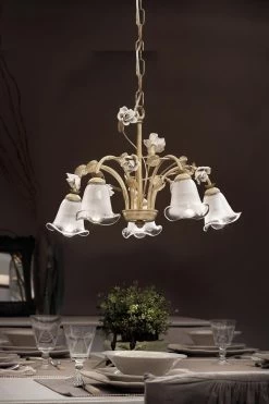 Le délicat verre sablé fumé des diffuseurs en corolle apporte la légèreté qui sublime la richesse de ce lustre 5 lumières de la collection classique Siena. Il est composé d’un corps en laiton doré qui forme les bras en branches feuillues qui supportent les diffuseurs, agrémentées de superbes rose ciselée en céramique de manière artisanale. Le lustre est suspendu par une chaine métallique dorée, c’est un modèle au noble mariage de matières, un incontournable qui illuminera un grand séjour ou une belle tablée d’un intérieur tant classique que contemporain. La maison italienne Ferroluce en activité depuis 1982 est synonyme d’élégance et grande qualité, elle livre une collection intemporelle réalisée entre les mains des meilleurs artisans.