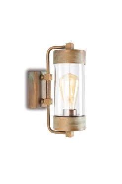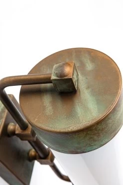 Cette applique Silindar aux airs de lanterne fait partie de la gamme Campagne. Positionnable tant verticalement qu’horizontalement, elle est constituée d’un cylindre de verre opale enchâssé entre deux pièce de métal sur un bras en pince fixé sur un support mural rectangulaire, avec une finition du métal vieilli qui donne une patine authentique au modèle parcouru de touches de vert-de-gris.