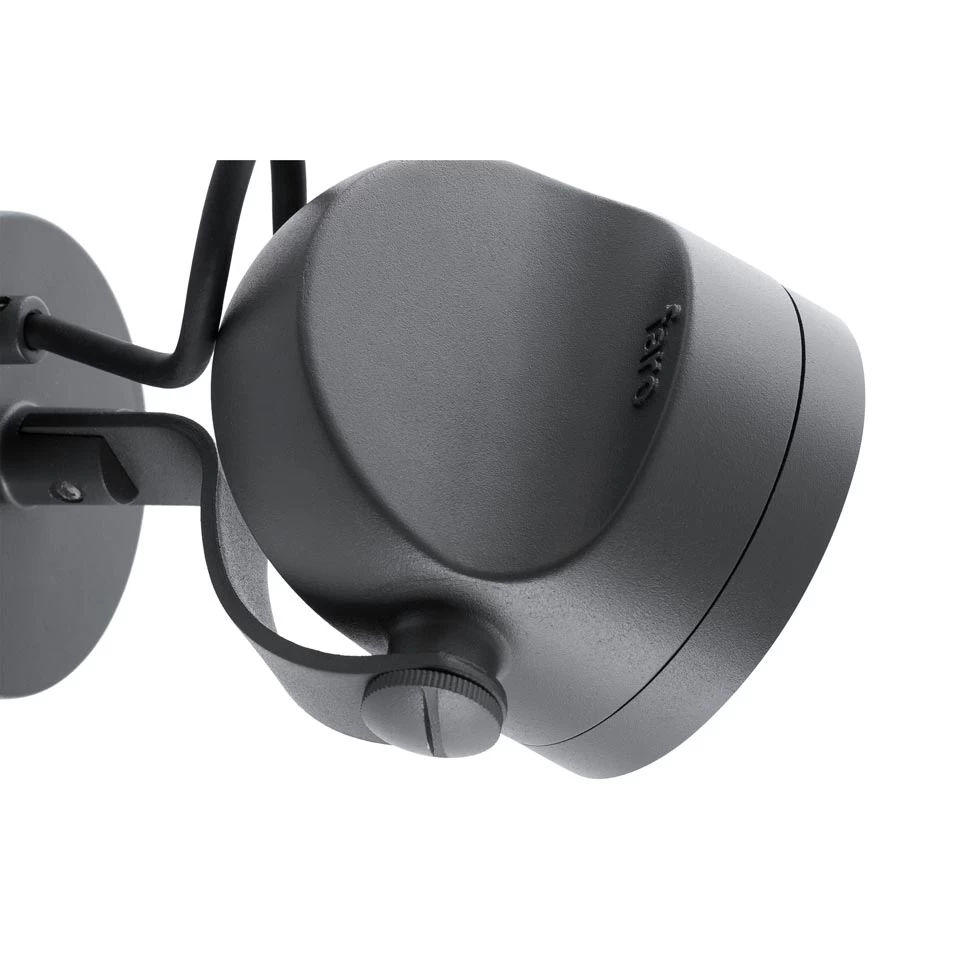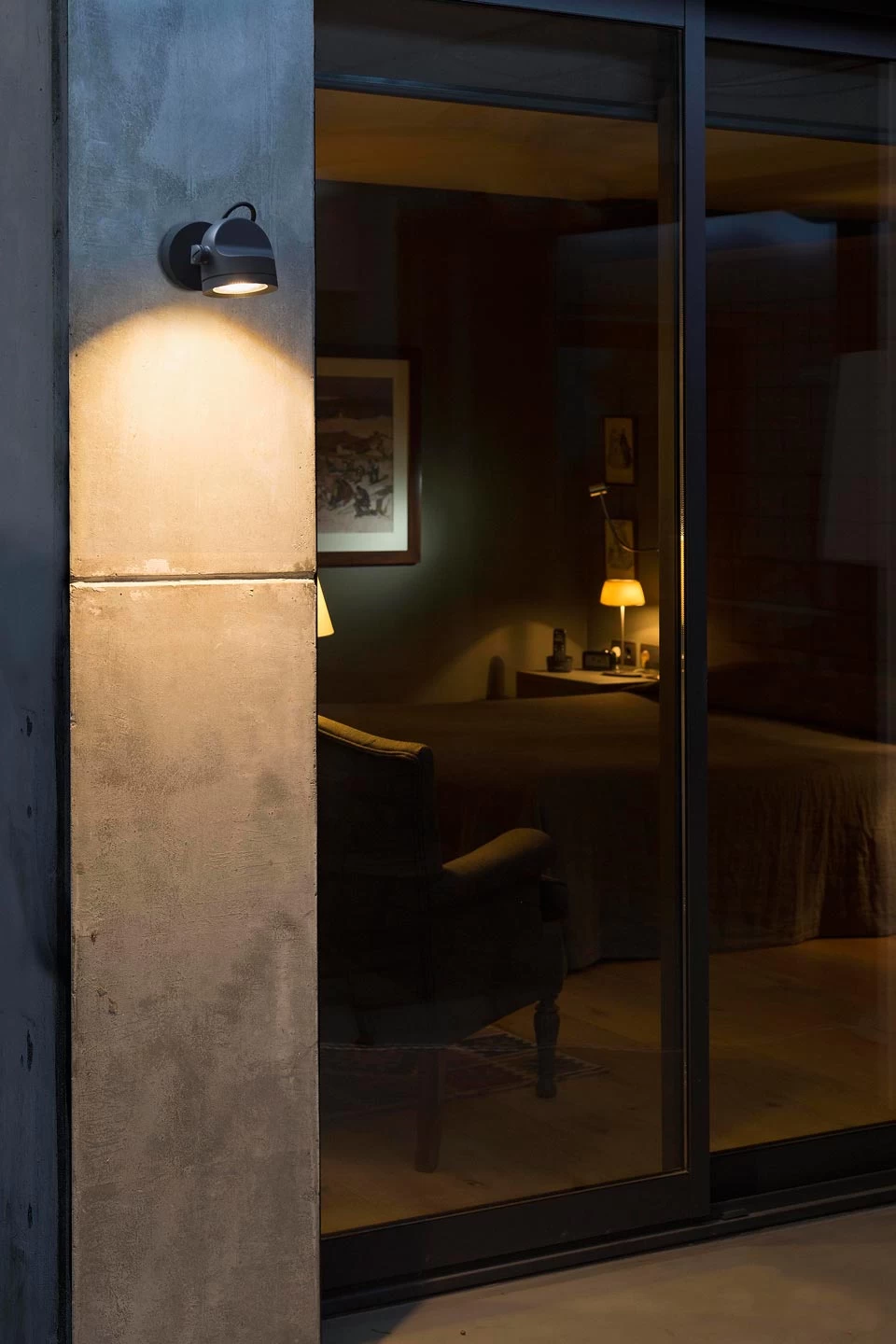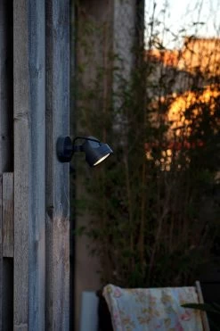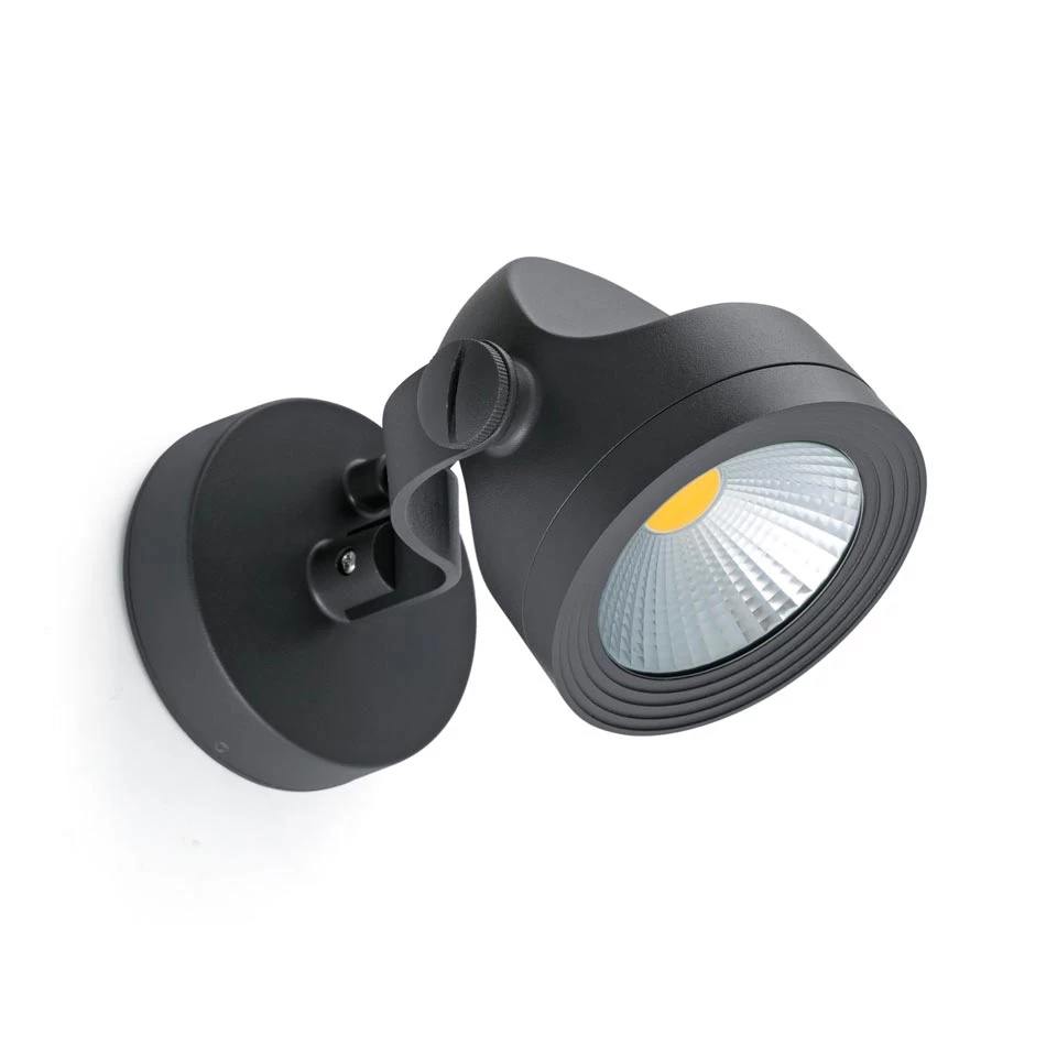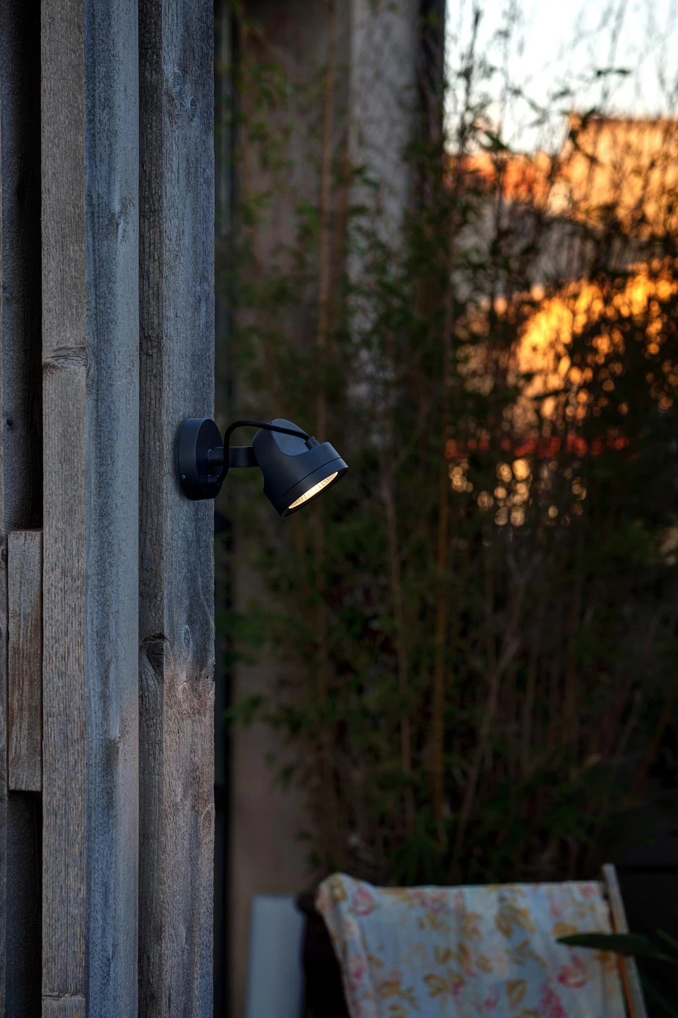 Petit spot d’extérieur, composé d’un module LED puissant derrière un diffuseur en verre transparent, dans une coque fixée sur une vis qui permet une articulation à 180° de gauche à droite et de bas en haut, en faisant un modèle très adaptable. Entièrement en aluminium noir, c’est un spot discret et résistant aux intempéries grâce à sa protection IP65. Son faisceau d’éclairage est large (80°) et puissant. Le socle mural rond abrite le driver.