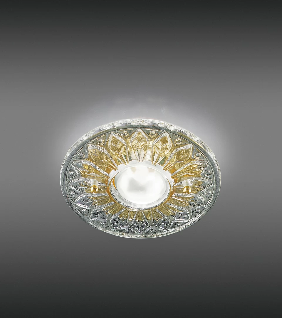 Superbe spot d’intérieur composé d’un disque de verre transparent posé sur une platine en métal doré, qui par transparence donne une teinte dorée au verre. Le verre est un délicat travail de sculpture, qui développe une série de motifs géométriques presque celtiques en relief. L’ampoule est placée au centre du disque. Un spot similaire avec une structure chromé est proposé sous la référence 19050121.