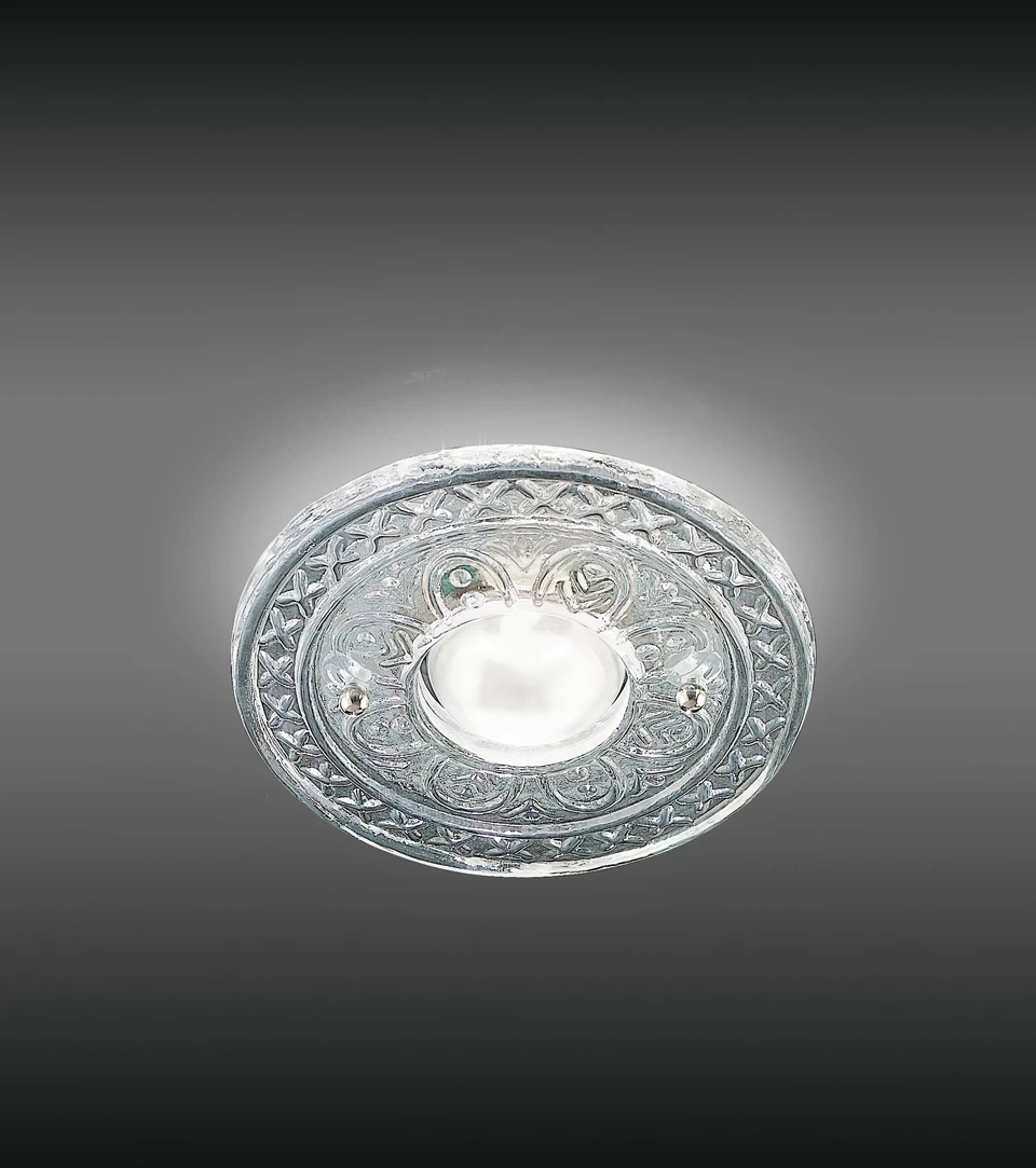 Superbe spot encastré composé d’un disque de verre sculpté posé sur une platine discrète en métal chromé. Le verre est un délicat travail de cannelure, qui développe une série de motifs géométriques presque celtiques en relief. L’ampoule est placée au centre du disque. Un spot similaire avec une structure doré est proposé sous la référence 19050122.