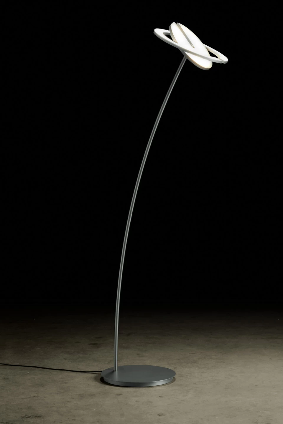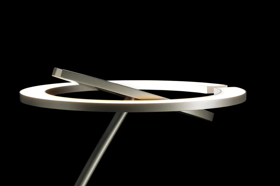 Superbe lampadaire argenté à l’inspiration astrale comme l’indique son nom, le lampadaire contemporain Supernova est doté d’une structure métallique épurée métal finition platine et double éclairage à la fois directionnel, indépendant et puissant par LED intégré. Le modèle est doté d’un socle rond surmonté d’un pied courbe équipé de deux plateaux emboités l’un dans l’autre, l’un en disque et l’autre en anneau, chacun équipé de modules LED intégrés. Le modèle est modulable à souhait puisque les plateaux sont équipés d’une fente qui permet de les faire pivoter indépendamment l’un de l’autre, il est également équipé d’un variateur de lumière à bouton pressoir situé sur le pied, du type « dim to warm » ce qui signifie qu’à mesure que l’on diminue l’intensité lumineuse, celle-ci se réchauffe en tirant vers le jaune, de 3100°k à 2700°k. Fondée en 1964 et marquée par son dévouement à la qualité, la maison familiale Holtkotter est une des dernières entreprises allemandes à encore manufacturer ses luminaires de A à Z, du métal brut au produit fini, avec une recherche permanente d’intégration des innovations technologiques sans jamais renoncer à la qualité de ses luminaires.