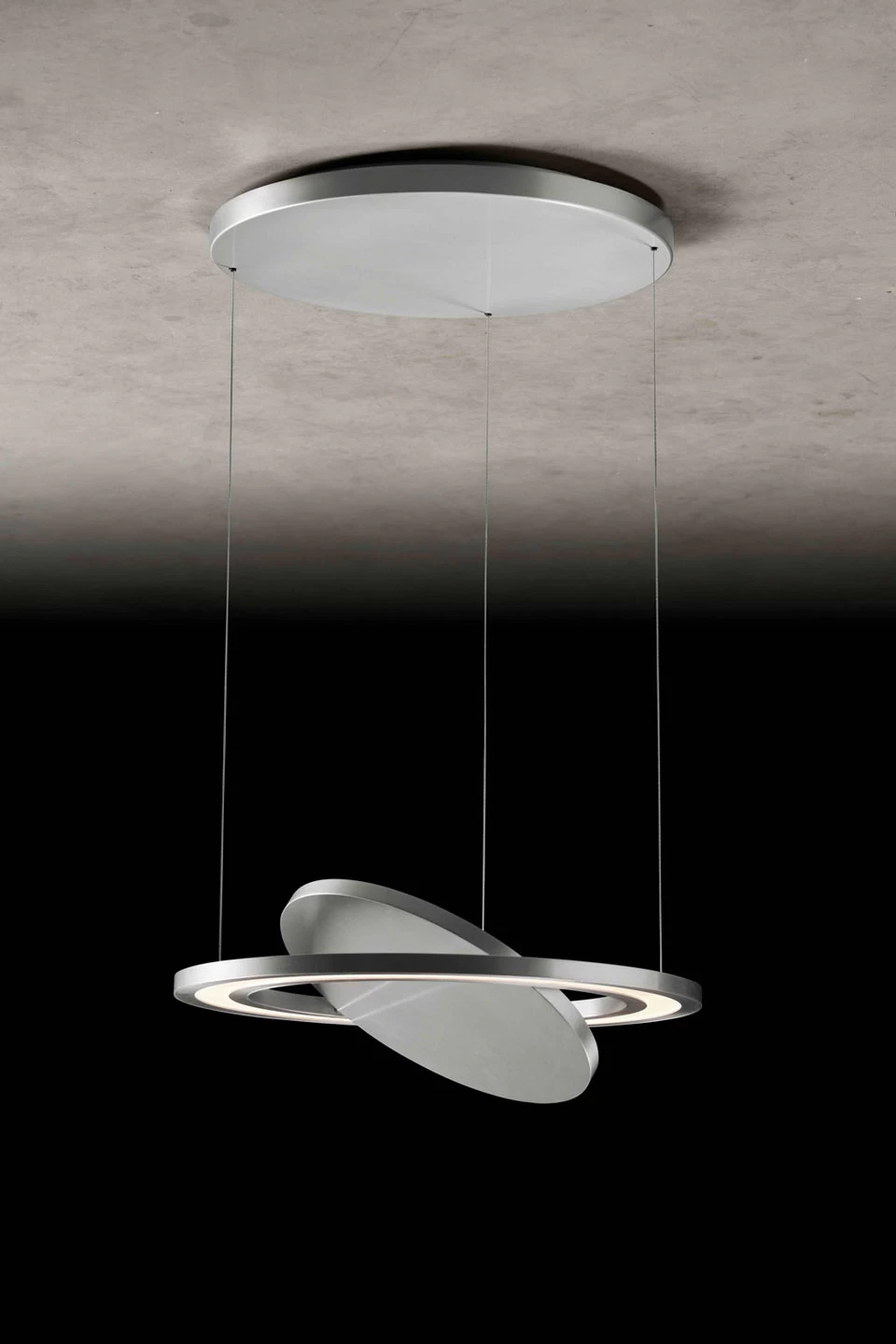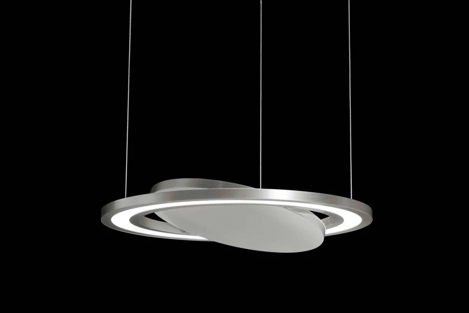 La suspension Supernova P argentée est comme une petite planète qui illumine de sa puissante lumière fournie par éclairage LED intégré, elle est modulable à souhait grâce à son double éclairage directionnel, marquée par un design contemporaine épuré en métal finition aluminium mat. Le modèle se présente sous la forme de deux plateaux métalliques, l’un en anneau et l’autre en disque, emboité l’un dans l’autre et suspendu par trois câble discrets, réglables en hauteur, reliés à un support de plafond rond. L’ensemble en métal aluminium mat est pensé pour que les deux éléments pivotent indépendamment, ils sont équipés sur une face de modules LED qui permettent selon la position d’obtenir un éclairage direct, indirect ou une combinaison des deux. Le modèle est également équipé d’un variateur de lumière du type « dim to warm » ce qui signifie qu’à mesure que l’on diminue l’intensité lumineuse, celle-ci se réchauffe en tirant vers le jaune. La variation se fait directement sur le luminaire grâce 2 boutons discrets placés sur le dessus de l’anneau. Ce luminaire est également équipé d’un système de variation de la hauteur intégré dans le support de plafond. En activité depuis plus de 35 ans et une des rares entreprises allemande restante à manufacturer ses luminaires du métal brut au produit fini, la maison familiale Holtkotter livre années après années des collections au design raffiné et aux finitions ciselées.