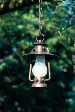 Suspendue à une chaîne, cette lampe tempête est parfaite pour une maison à la campagne, à la mer ou à la montagne. Le verre est dépoli, ce qui permet un résultat esthétique excellent même si on utilise une ampoule à économie d’énergie LED ou fluo-compacte. La construction en métal patiné est particulièrement solide, ce luminaire fabriqué de façon artisanale en Allemagne dans les forges de la société Robers est conçu pour durer. Dans cette mini-collection au style lampe tempête, il existe un lampadaire (12090013), une lampe à fixer (12090014), une applique (12090015) et une lampe suspendue à une chaîne (12090016).