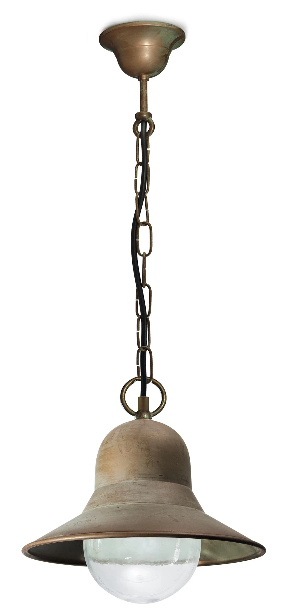 Très beau travail réalisé sur cette suspension en laiton vieilli forme cloche. Elle est munie d’un câble d’alimentation et d’une chaîne de suspension reliée par un anneau à une coupole protégeant un verre transparent où se trouve l’ampoule. Son cône de plafond est également en laiton. Ce modèle est conforme à la norme de protection IP44 et ne craint pas la corrosion due au sel. Très sobre, elle peut être aussi installée à l’intérieur d’une maison à la campagne ou au bord de la mer. La fabrication en laiton massif d’excellente qualité, est effectuée dans les ateliers de Moretti Luce, en Italie.. Existe aussi en applique avec tige courbe courte réf.15090434, applique bec long réf.15090435, en applique col de cygne réf.15090436 et en plafonnier réf.1509438.