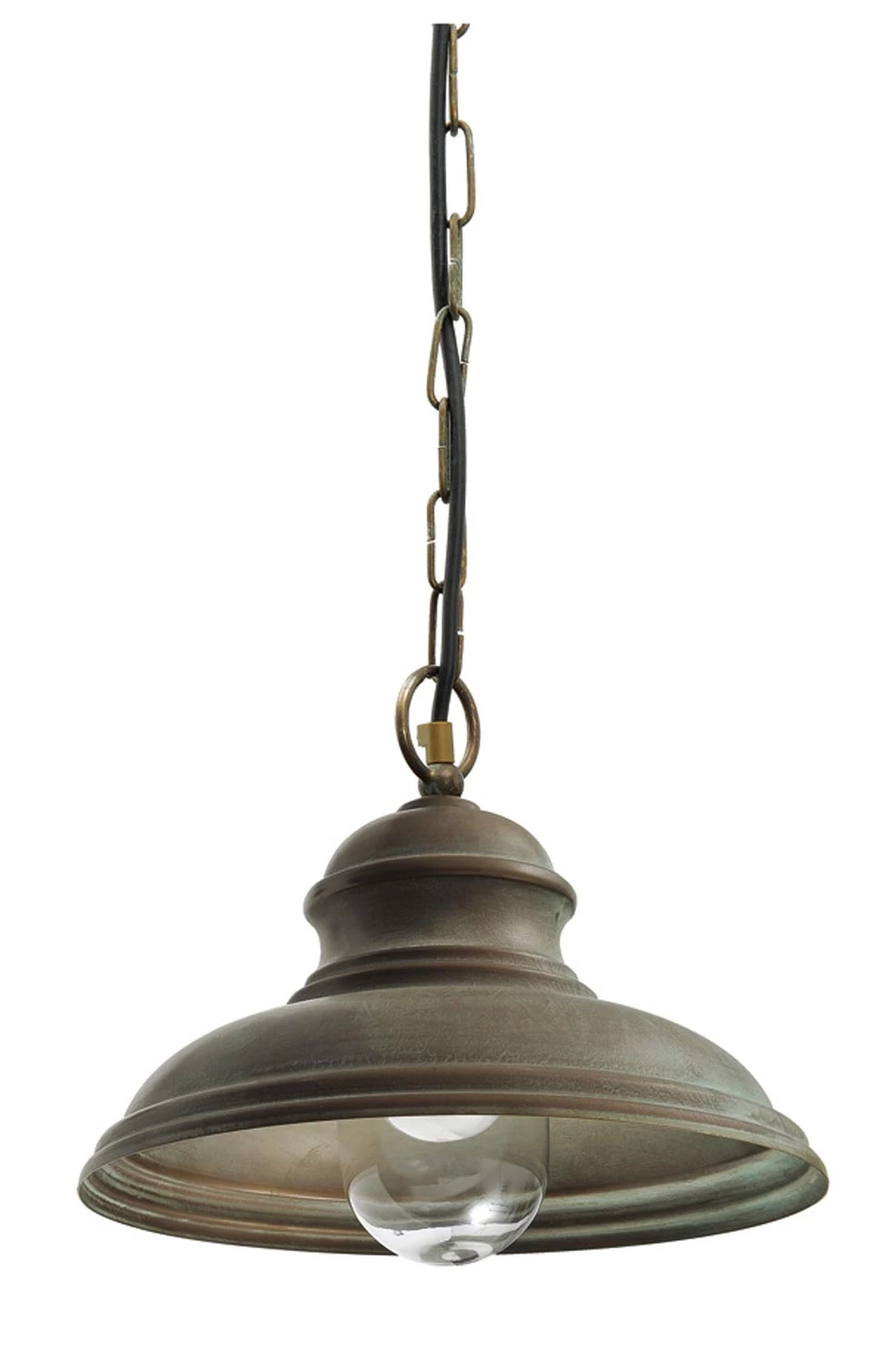 Un design beau et sobre pour cette suspension entièrement en laiton vieilli est composée d’une large coupole retenue par une chaîne attaché sur un cône de plafond. L’ampoule est protégée par un verre transparent. Ce modèle est conforme à la norme de protection IP44 et ne craint pas la corrosion due au sel. Sobre, elle peut être également installée à l’intérieur de la maison à la campagne ou au bord de la mer. La fabrication en laiton massif d’excellente qualité est effectuée dans les ateliers de Moretti Luce, en Italie.