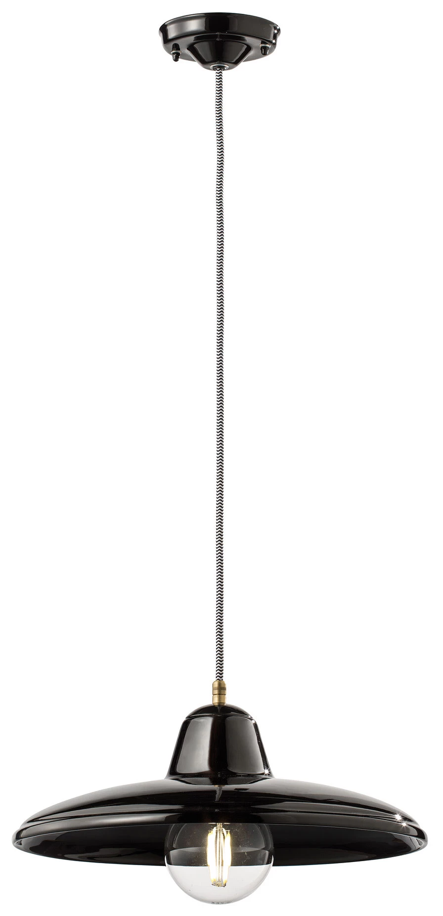 Chic et rétro avec sa céramique émaillée noire, cette suspension de la collection Black and White se compose de ce large abat-jour à l’arrondi harmonieux, suspendu à un cordon électrique en tissu noir et blanc, qui se marie à merveille avec l’aspect brillant de la céramique. Ferroluce est une maison italienne qui travaille la céramique depuis 50 ans, et qui réussit le pari de marier céramique traditionnelle à des formes de luminaires contemporaines et chics. La collection comprend également un plafonnier en deux coloris (18070265, 18070266), une petite applique (18070264), et une grande applique en deux coloris (18070267, 18070268).