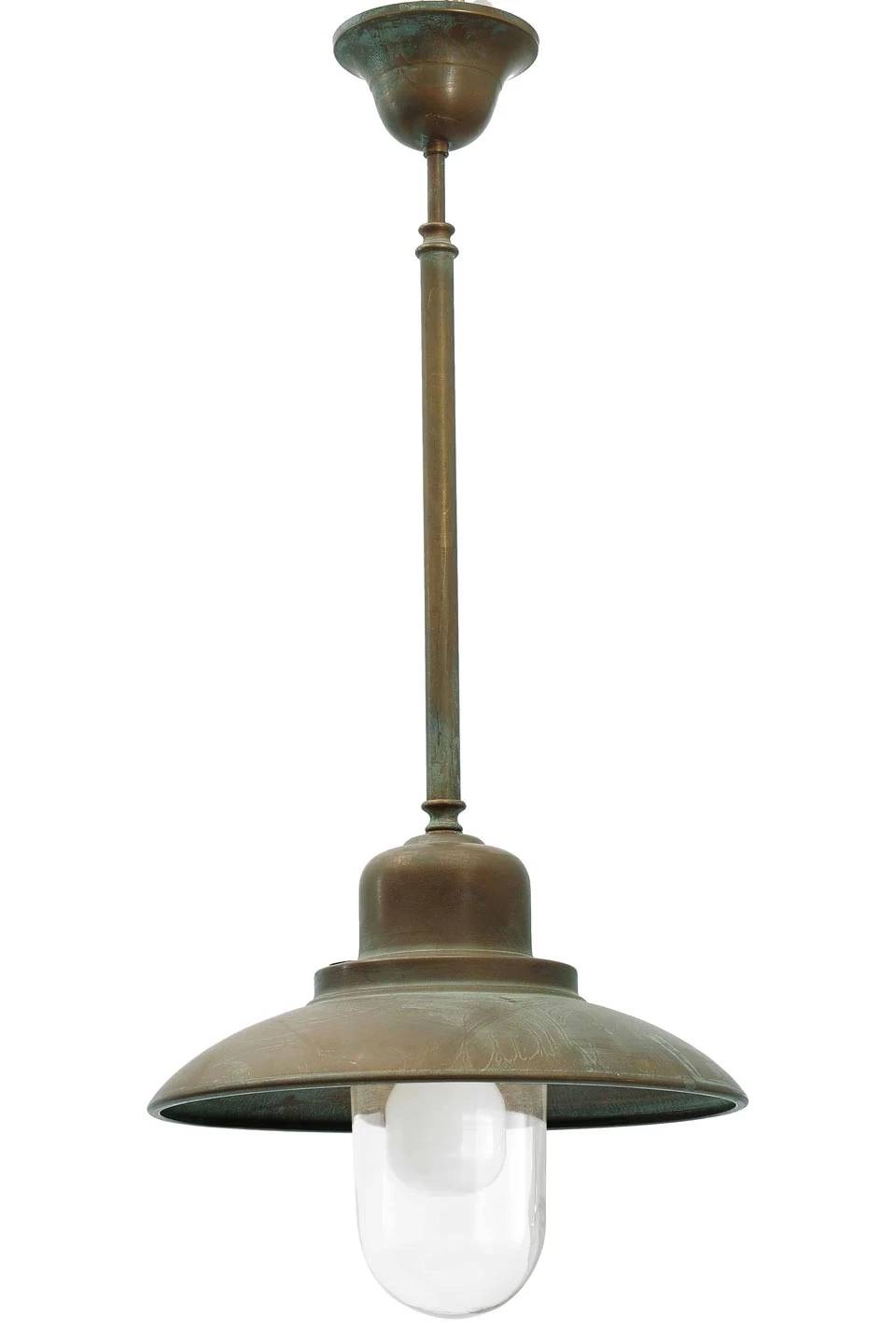 Elégante et raffinée, cette suspension sur tige pour l’extérieur est réalisée en laiton vieilli. Le réflecteur est placé à la base d’une tige de laiton reliée au cône de fixation au plafond. Le laiton est recouvert d’une patine, aux discrets reflets vert-de-gris. Un globe en verre transparent complète cet ensemble, assurant une protection IP44 contre la pluie. Attention, le fabricant précise que la patine employée n’est pas prévue pour une exposition directe aux intempéries marines. A voir également, la suspension sur chaîne 13060206 assortie.