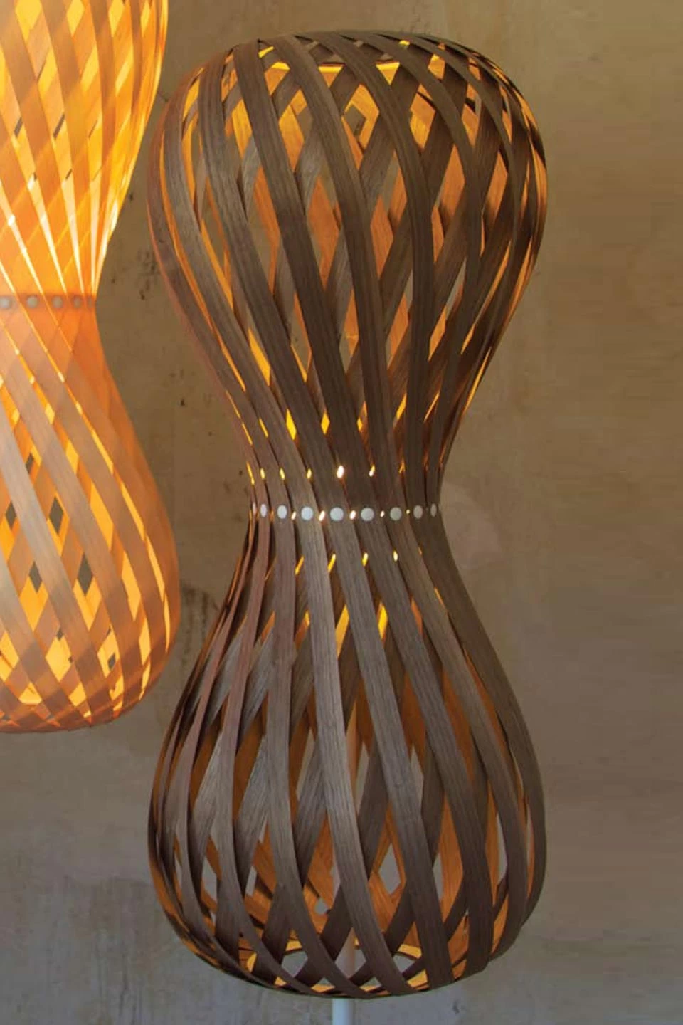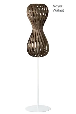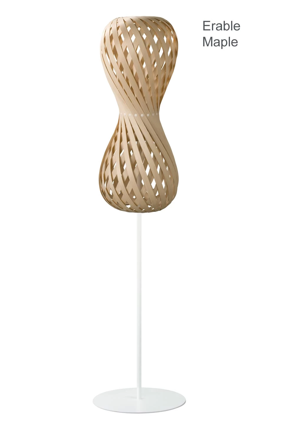 Cette extraordinaire lampadaire en forme de sablier arrondi est rĂ©alisĂ©e en lattes de bois d’Ă©rable. Celles-ci sont rivetĂ©es Ă leurs deux extrĂ©mitĂ©s sur un disque interne en mĂ©tal laquĂ© blanc, et Ă leur milieu sur une forme cylindrique totalement occultĂ©e, placĂ© en partie mĂ©diane de ce luminaire. La forme prise par ce lampadaire provient de la torsion apportĂ©es aux lattes de bois très souple. Le concept est tout Ă fait original, d’une grande Ă©lĂ©gance intellectuelle. Le rĂ©sultat, qui bĂ©nĂ©ficie d’une sĂ©lection rigoureuse des produits ainsi que d’une fabrication Ă la main particulièrement soignĂ©e, est magnifique. Au centre du lampadaire se trouve la source de lumière, montĂ©e sur un bâti mĂ©tallique solide. La lumière se reflète sur la face intĂ©rieure des lattes de bois, avant de rayonner tout autour du luminaire. La lumière produite est parĂ©e de tonalitĂ©s chaudes, vive mais jamais Ă©blouissante. Ce lampadaire fournit un excellent Ă©clairage d’ambiance. Pour changer l’ampoule, rien de plus simple: les lattes sont souples, on y glisse très facilement la main. Après opĂ©ration, elles reprennent leur forme initiale. Ce formidable lampadaire existe en deux matières: bois d’Ă©rable et de noyer. Le bois est verni, et renforcĂ© sur sa face intĂ©rieure d’une couche d’enduit cellulosique transparente, qui assure souplesse et tenue. Ce lampadaire est placĂ© au sommet d’un pied tubulaire et d’un socle en forme de disque. Ces deux parties mĂ©talliques sont laquĂ©es au four en blanc. Ce luminaire est fabriquĂ© Ă la main en Allemagne, dans les ateliers de Dreizehngrad, situĂ©s dans la ville d’Alpirsbach, dans la ForĂŞt Noire.
