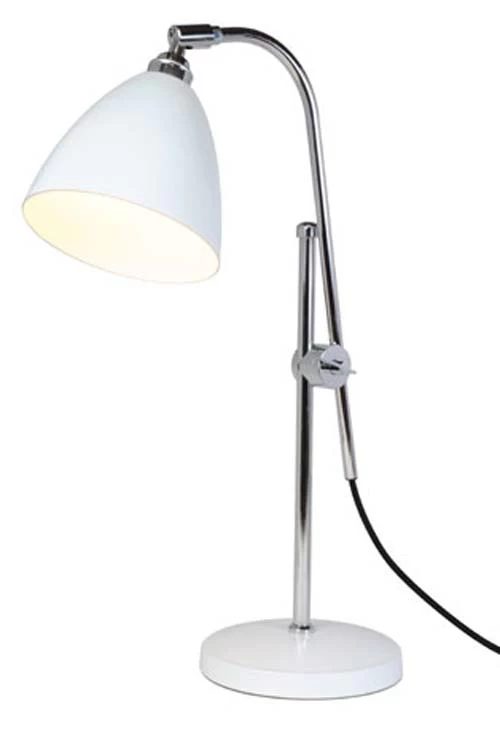 Cette lampe de bureau Task blanche appartient Ă la gamme la plus emblĂ©matique d’Original BTC, qui comprend de nombreuses lampes de bureau, plusieurs appliques et un plafonnier, toutes munies d’un rĂ©flecteur Ă la forme très pure, très caractĂ©ristique et indĂ©modable. On peut voir des lampes identiques dans de nombreux films anglais des annĂ©es 50. Le modèle prĂ©sentĂ© sur cette page a un pied droit simple, sur lequel coulisse un sous-ensemble muni d’une rotule. Celle-ci maintient une seconde tige chromĂ©e, recourbĂ©e, Ă l’extrĂ©mitĂ© de laquelle est fixĂ©e une seconde rotule tenant le rĂ©flecteur de la lampe. Cet assemblage permet un rĂ©glage prĂ©cis de la hauteur et de l’orientation de la lampe. Le pied, de couleur assortie au rĂ©flecteur, procure Ă la lampe une très bonne stabilitĂ©. Cette lampe de bureau existe en mĂ©tal laquĂ© noir, crème, vert olive, chrome, gris, rouge et blanc. Le fil Ă©lectrique est recouvert de tissu.