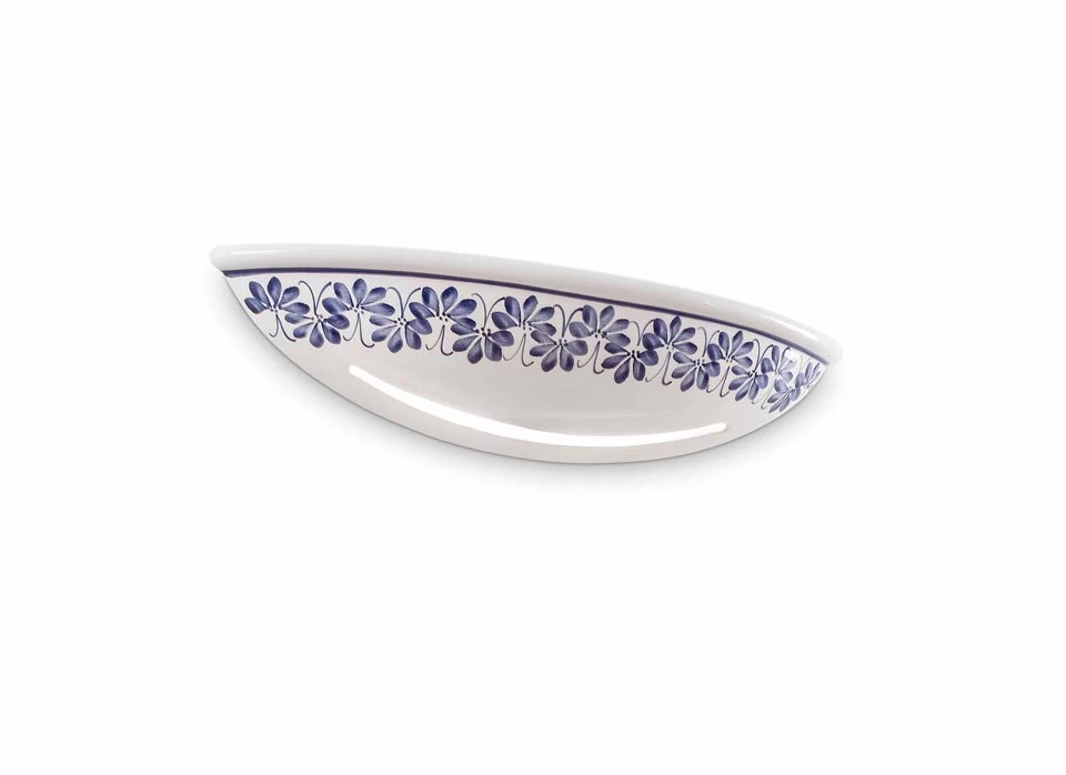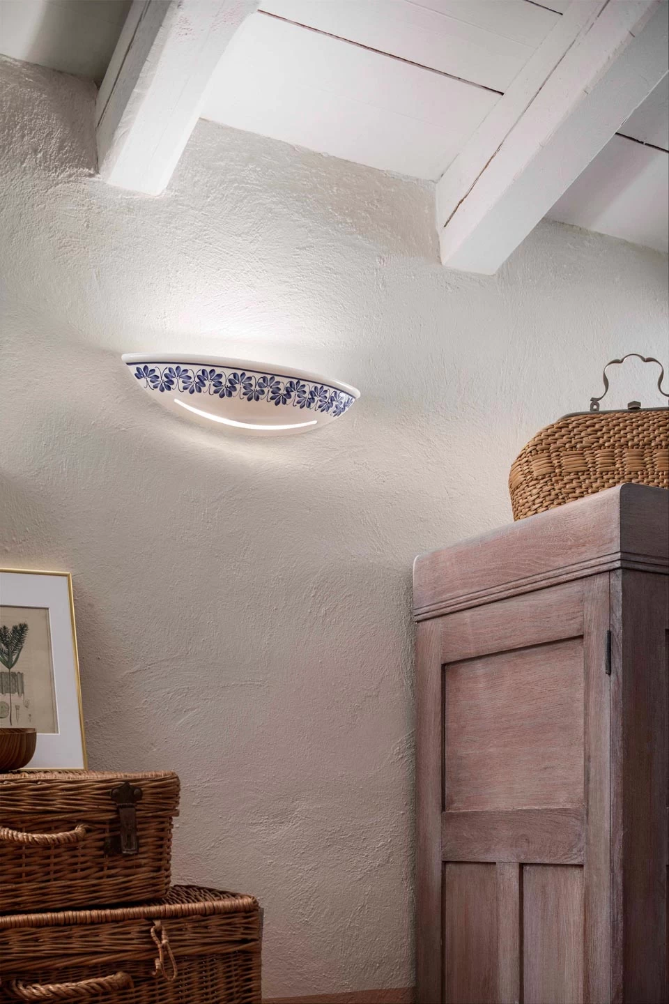 Superbe applique Trieste en céramique au style classique. L’applique est composée d’une demie vasque allongée en céramique blanche délicatement peinte à la main d’un motif floral et liseré bleu sur toute la longueur. La lumière est principalement projetée vers le plafond, mais notez la fente d’ouverture sur la partie inférieure de la vasque qui laisse échapper une lumière douce. Une série de lampes en céramique de la maison italienne Ferroluce, en activité depuis 1982, dont le nom est synonyme d’élégance et grande qualité, avec des collections intemporelles réalisées entre les mains des meilleurs artisans.