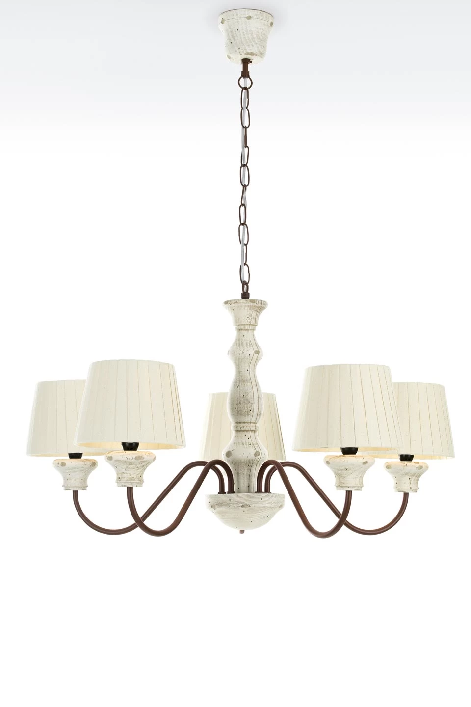 Ce modèle de lustre incarne l’esprit de la ligne Turn Rustico. Chacun des cinq abat-jours en tissu plissé écru est monté sur un bras en métal qui décrit un courbe avant de se relier au corps, en bois de pin sculpté et teinté d’une patine écru. Une chaine de suspension retient le lustre et l’assemble avec un cône de plafond en bois assorti. La finition patinée donne un air élégant mais chaleureux à celuminaire. La collection Turn Rustico est une rencontre entre le rustique et le contemporain. La maison Paulo Coelho se distingue par des abat-jour d’une grand valeur esthétique et des collections très complètes déclinées en lampes, lampadaires, appliques et suspensions. La collection Turn Rustico comprend également une lampe référence 16060836, un lampadaire référence 16060837, une suspension 3 lumières référence 16060838, une petite applique référence 16060840 et deux appliques double références 16060841, et 16060842.